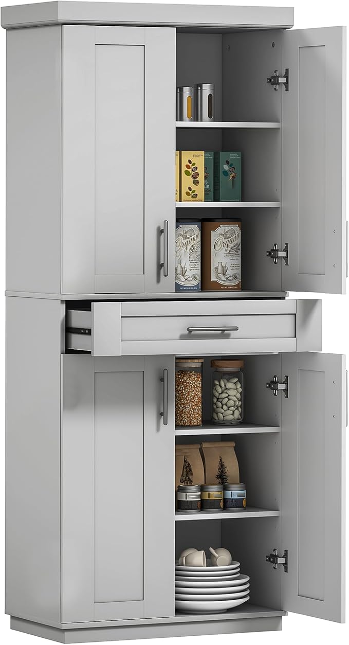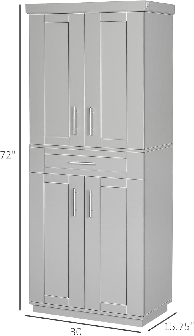 HOMCOM 72" Kitchen Pantry Cabinet, Freestanding Tall Storage Cabinet with 4 Doors, Drawer and 3 Adjustable Shelves for Dining Room, Gray