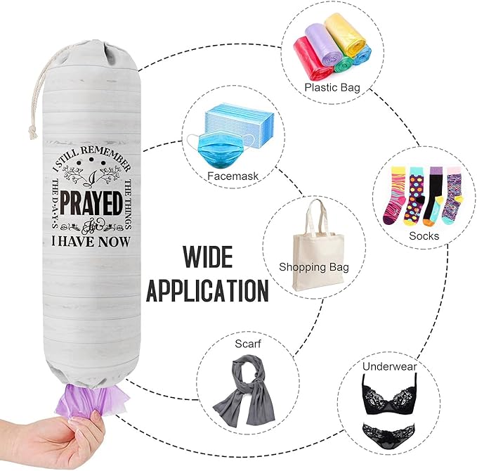 - Humanized Designs: The garbage bag dispensers are designed with adjustable drawstring closure for free adjustment, it's convenient to store large size shopping bags, tote bags, rolls, etc. Comes with an elastic open bottom, it gives easy access to the inside bag, preventing pulling several bags at once. Also, the top of grocery bag holder carrier designed with a portable loop makes the fashion bag hung on the closet, wall, refrigerator or door easily, maximizing the use of vertical space.
