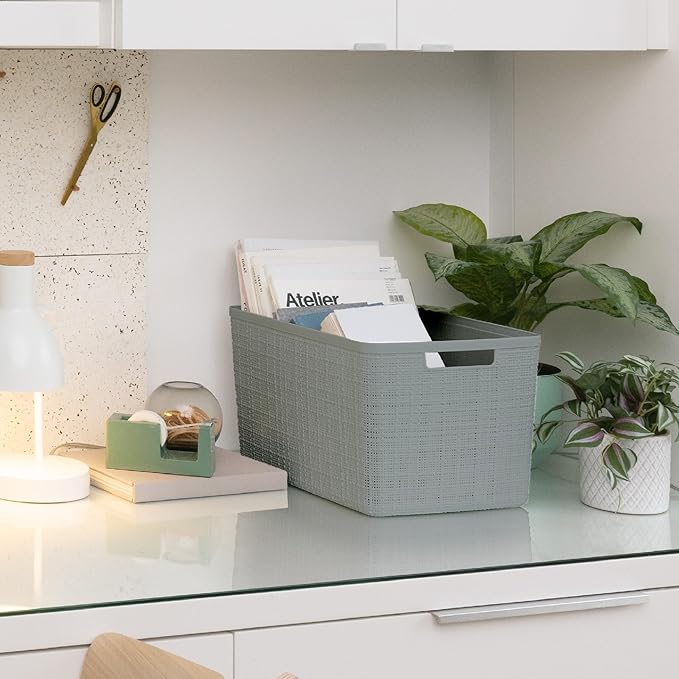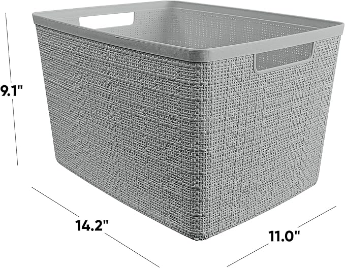 Curver Set of 4 Jute Large Decorative Plastic Organization and Storage Baskets, Perfect Bins for Home Office, Closet Shelves, Kitchen Pantry and All Bedroom Essentials, Grey