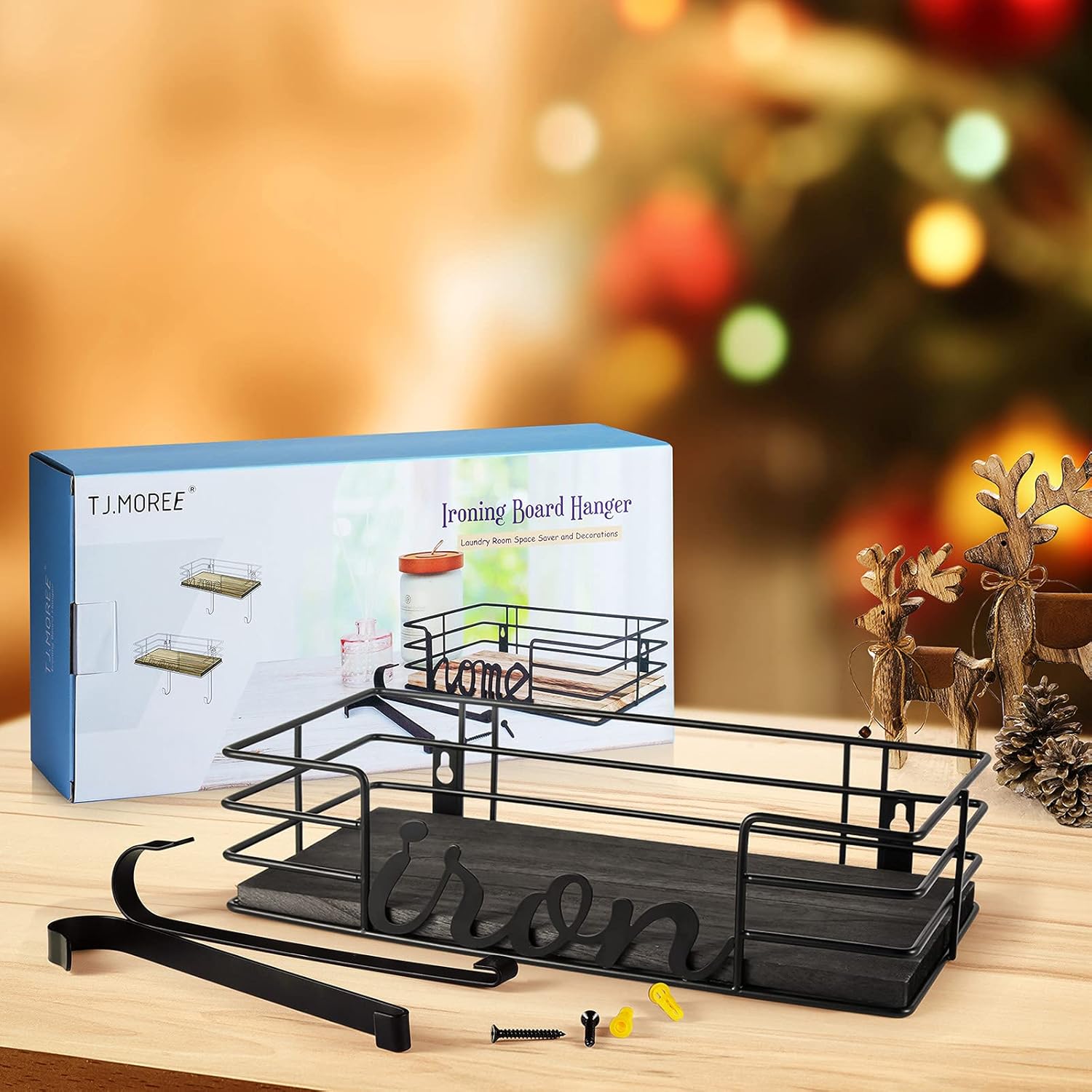 - STURDY AND STYLISH: TJ.MOREE ironing board hanger includes a natural wooden element in its functional basket. While ensuring stored items are secure, it creates a rustic yet modern style.