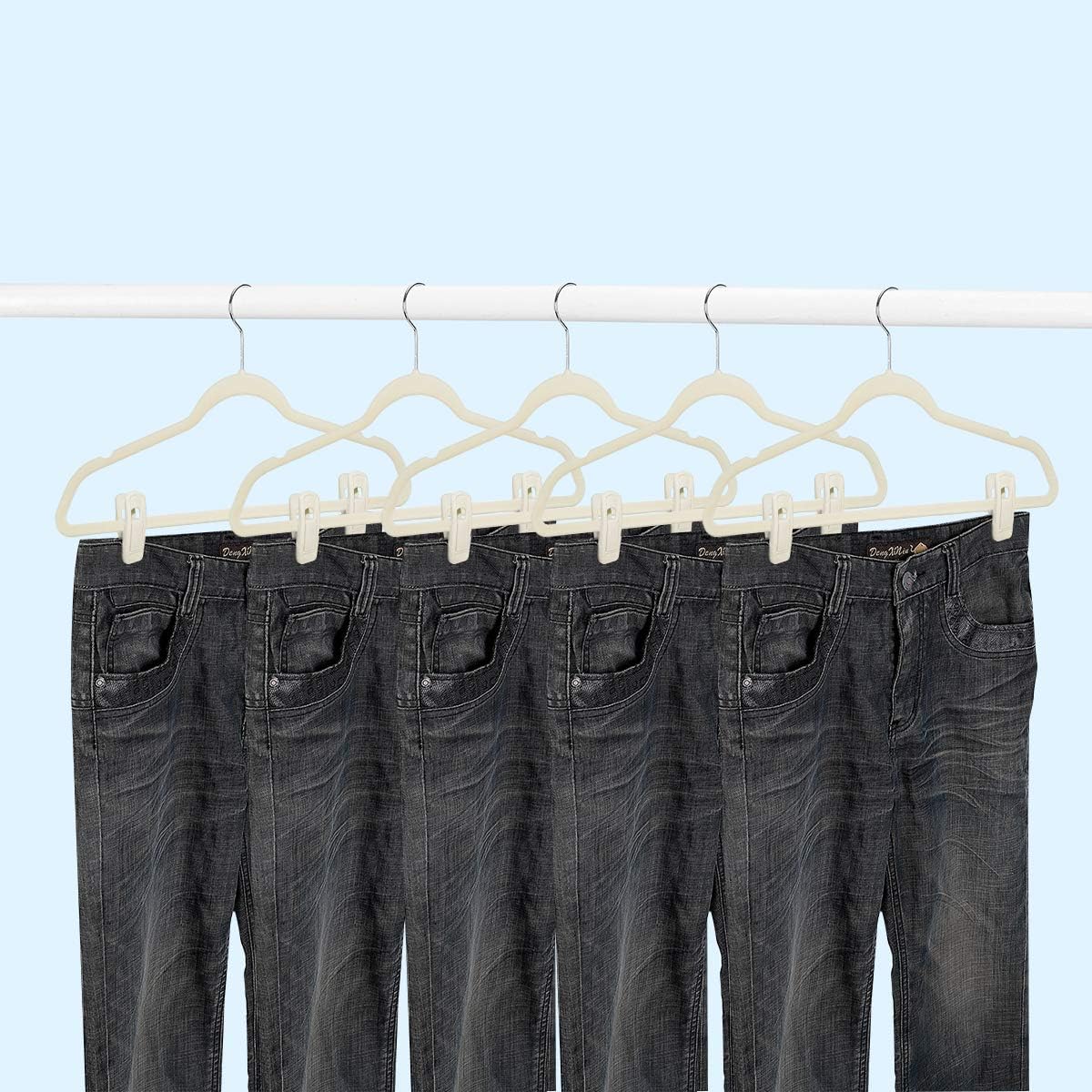 - ā High-quality material: These hanger clips are made of PP material and covered with high-grade soft beige velvet. It is very sturdy and durable. The beige velvet hanger clips of 20 packs can be easily matched with velvet hangers of any color and size. It looks very elegant and beautiful.