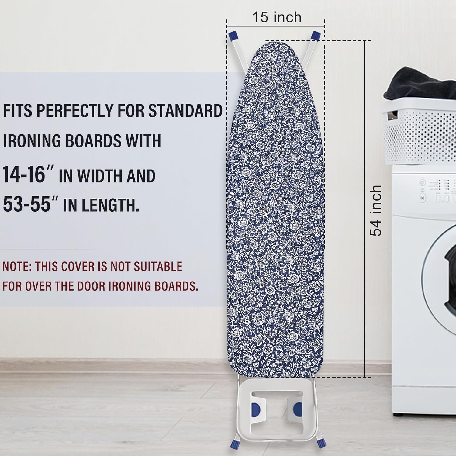 - FITS STANDARD SIZE BOARDS: this ironing board cover is designed to fit 13-15inch in width and 52-54inch in length standard full size ironing boards.Ironing board cover and pad varies in size,please measure your ironing board before purchase to avoid unnecessary trouble (Note:No Ironing Board included.)