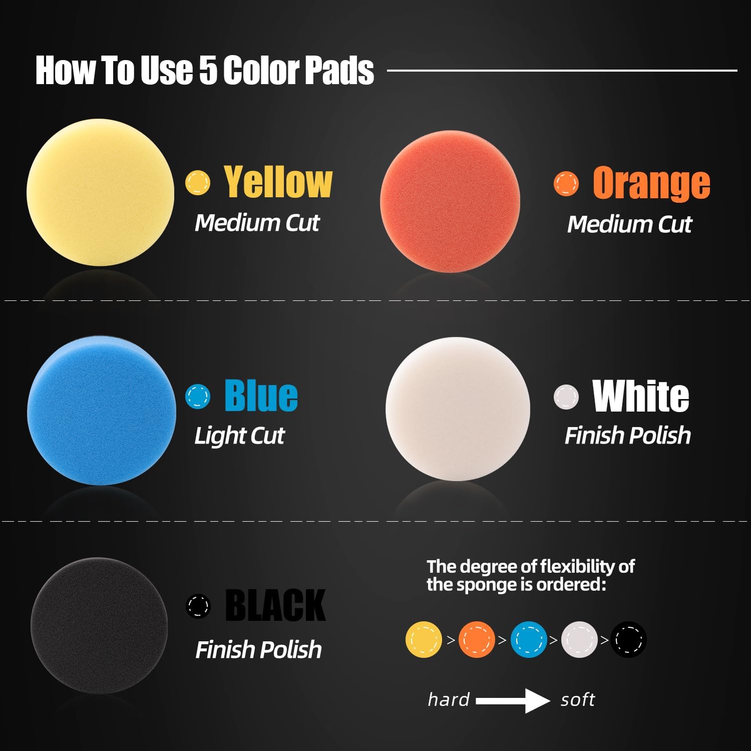 - ◆Specifics◆ Prime quality wool pad, sponge pad, bendable, washable and reusable. Different colored sponges have different softness,suitable for polishing rough and small areas. With Adhesive backing, you can change pads just in seconds.