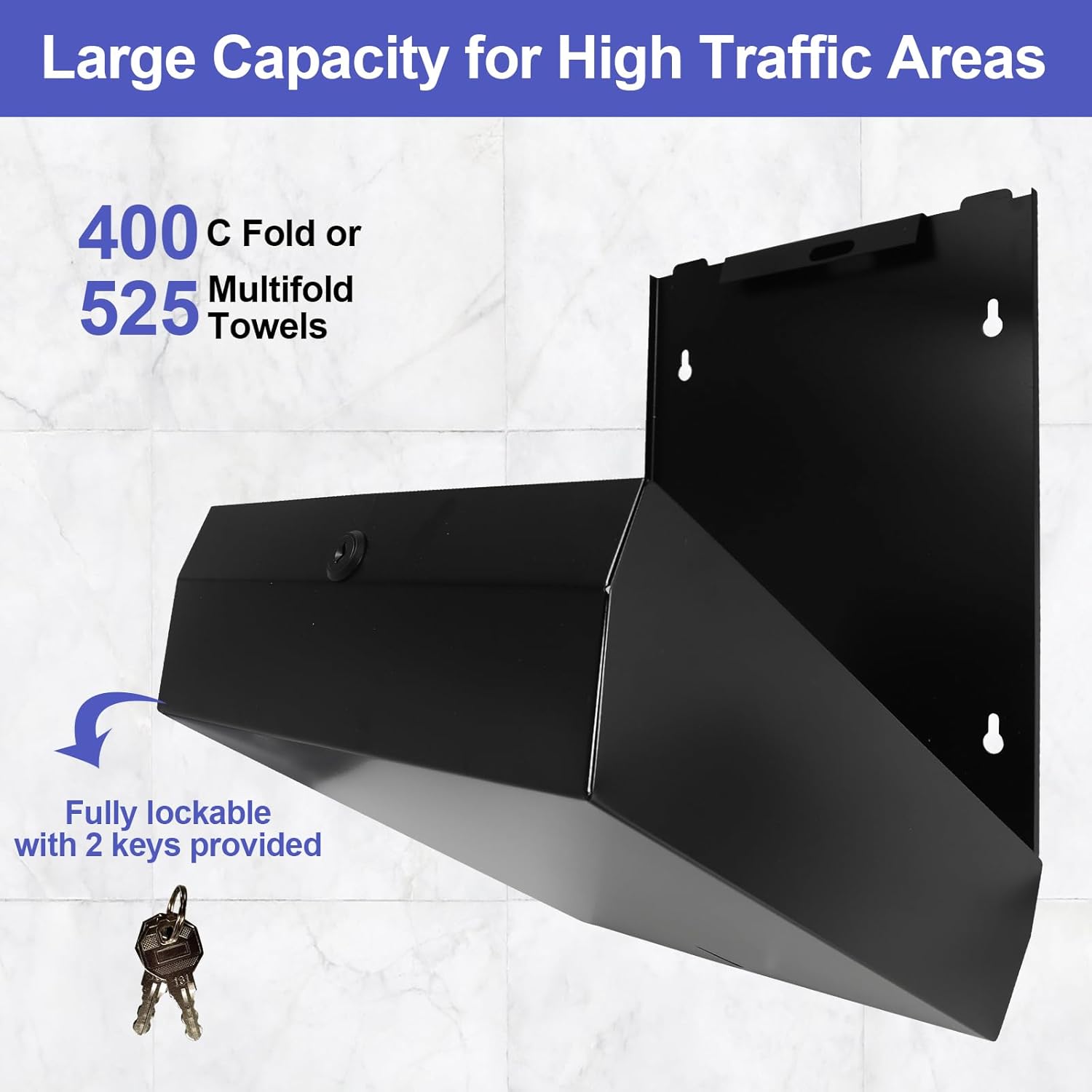Paper Towel Dispenser Wall Mount, Matte Black Stainless Steel Commercial Paper Towel Holder with Lock, Large Capacity 400 C Fold/525 Multifold Towels