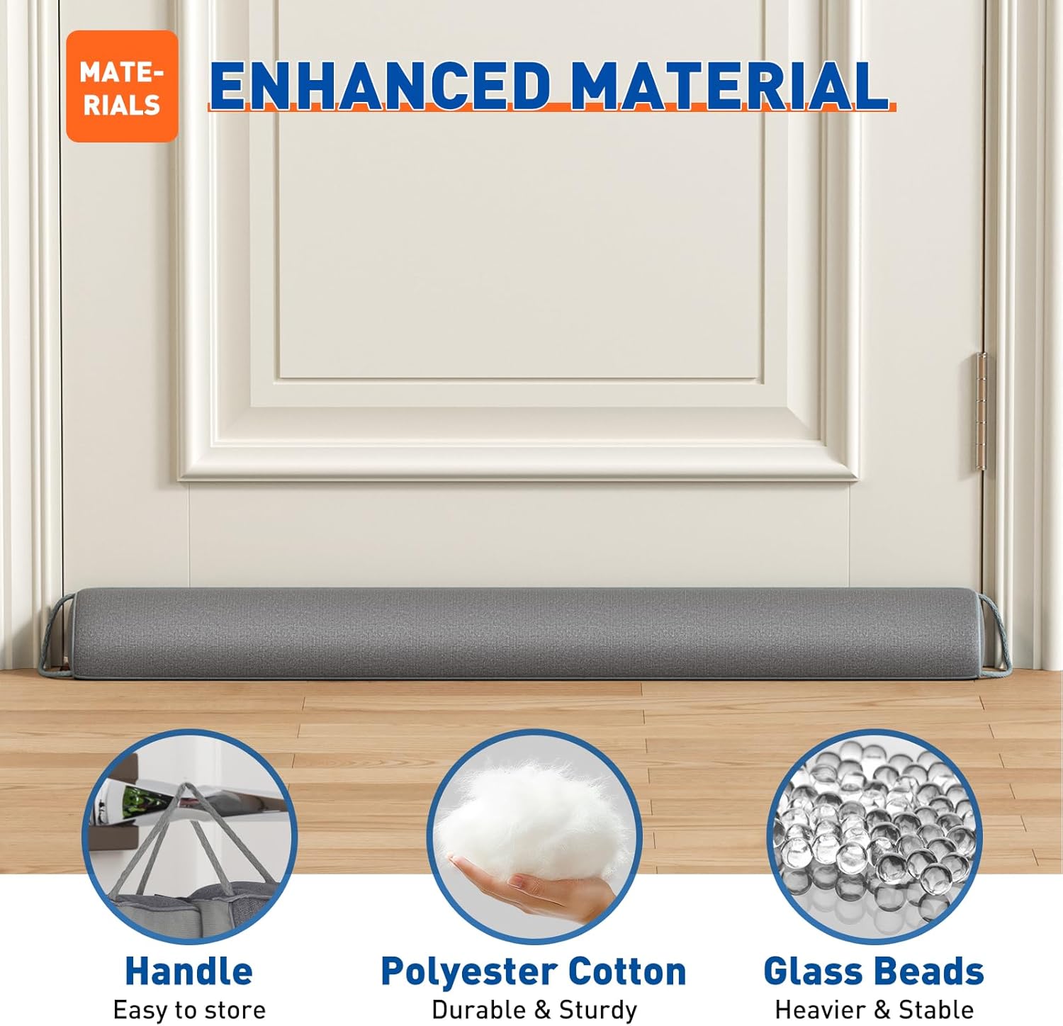 - ENHANCED MATERIAL – This under door draft stopper is made with soft cotton and filled with glass beads for added stability, improving thermal, soundproof and dustproof performance. It weighs 2.18 lbs and fits the door snugly.