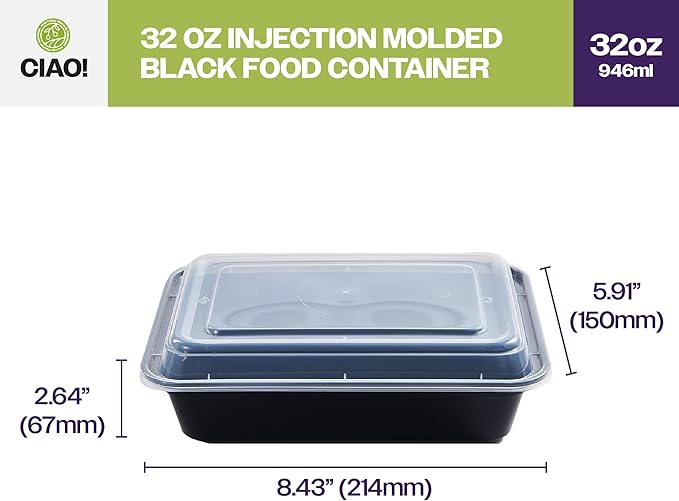 CIAO! Heavy Weight 32oz Injection Molded Microwavable Black Rectangular Food Container with Lid (150/case)