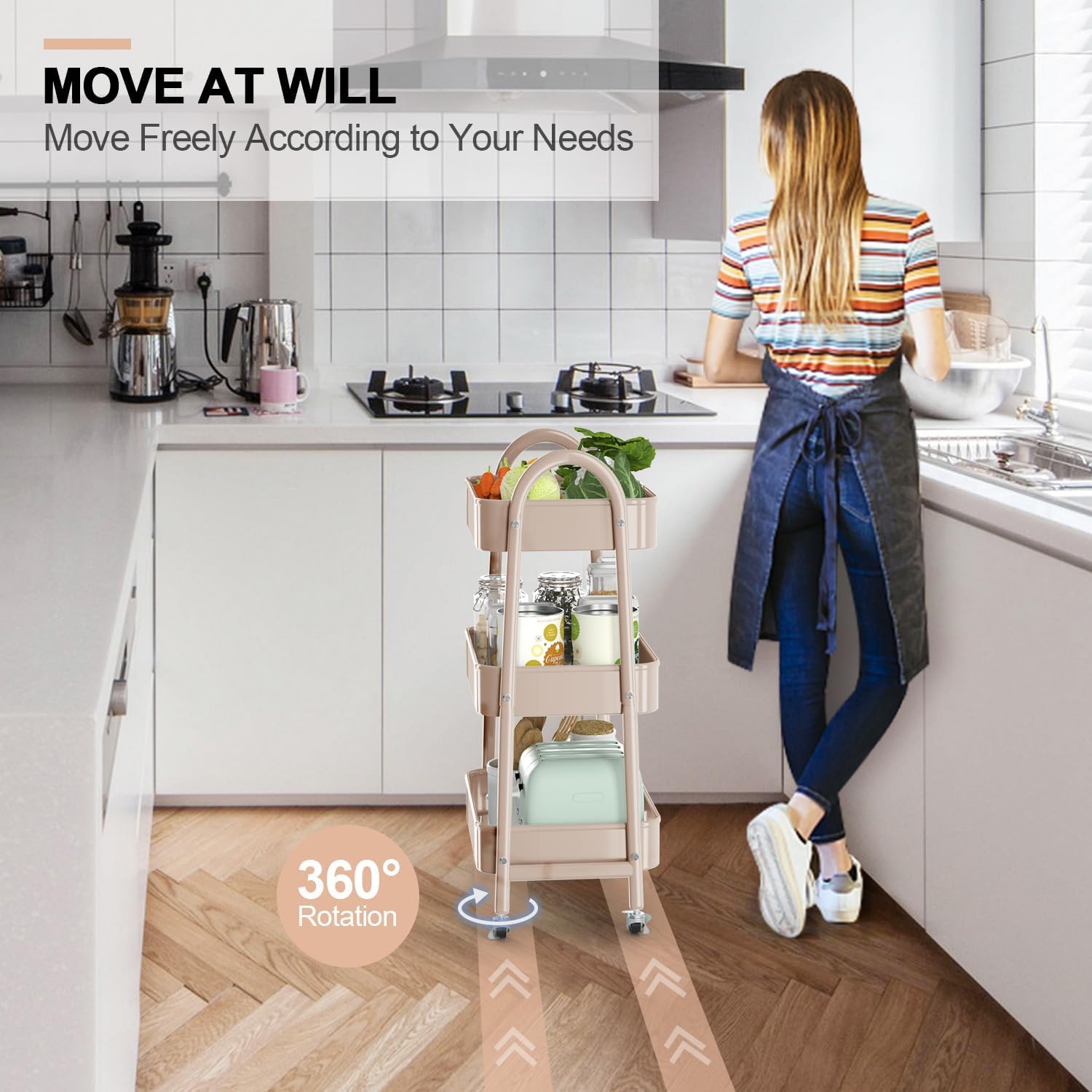 - Move or Lock At Your Will: Our rolling cart is equipped with 4 360° rotating wheels, easy to carry around and change place at will, two of wheels are lockable, provide stability. The modern curved handles design makes it more convenient to push and pull around as needed.