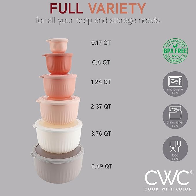 - Cook with Color 12 piece plastic mixing bowl set - non slip bowls with lids; easy to clean, sturdy mixing bowls.