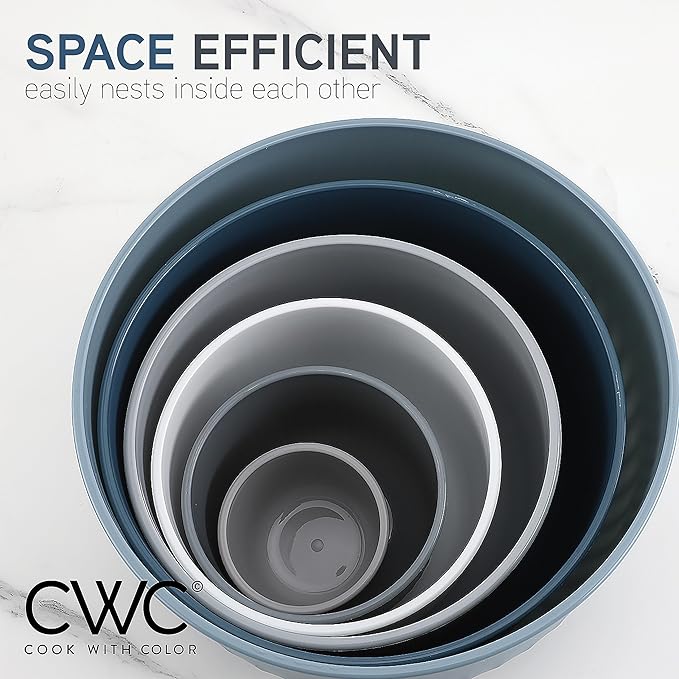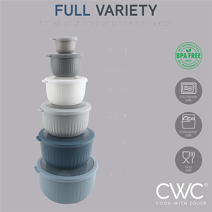 - Cook with Color 12 piece plastic mixing bowl set - non slip bowls with lids; easy to clean, sturdy mixing bowls.