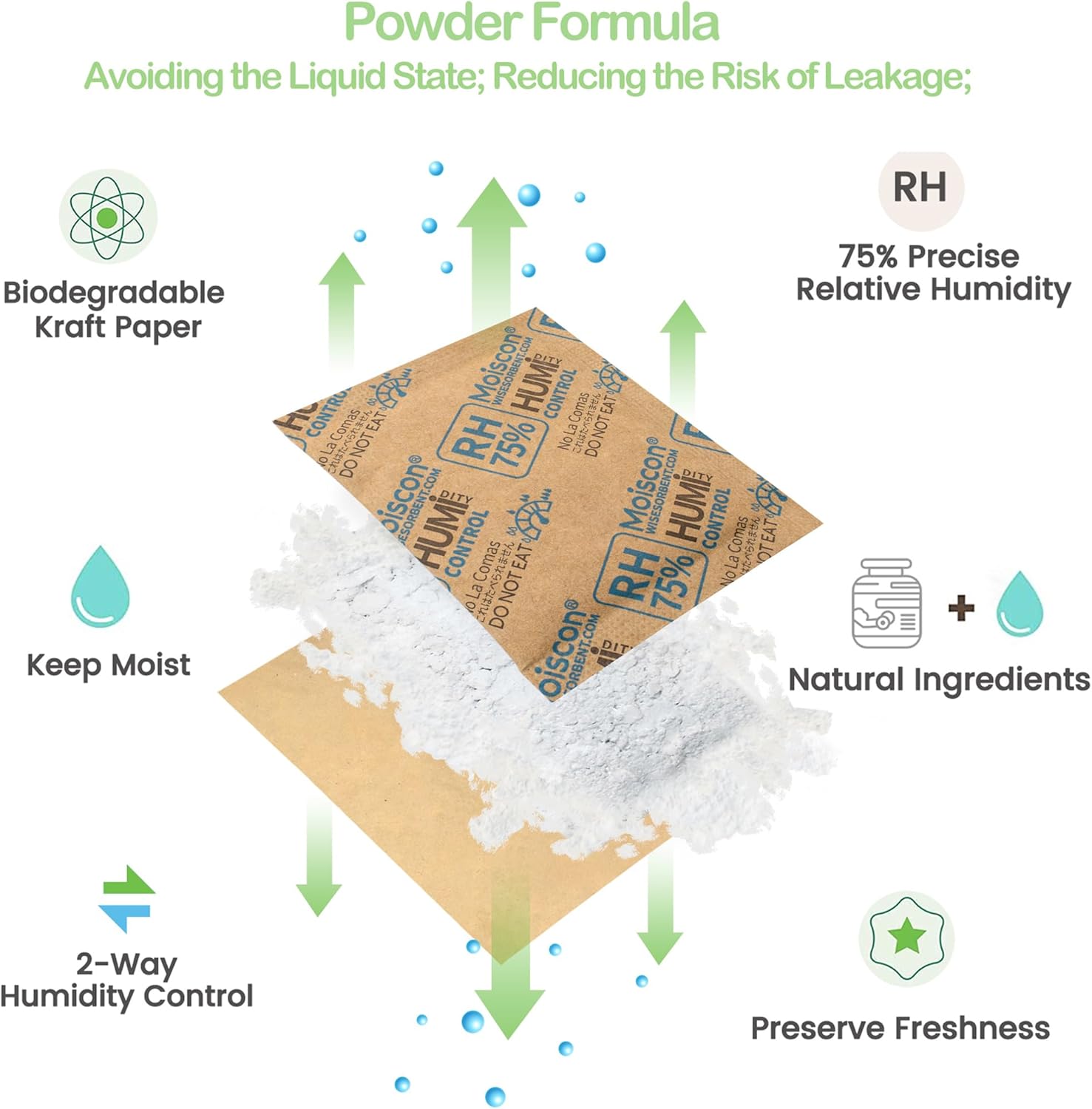 - 【Packed with Kraft Paper】: Humidity Control Packet is packed with environmentally friendly and biodegradable kraft paper, ensuring safety and harmlessness. Kraft paper packaging material is not only biodegradable and recyclable but also offers excellent tear resistance, breathability, and dust-free properties. Buy using humidity pack you don't have to worry about adding water to the box or using a hygrometer anymore. Your box or jars naturally keeps its humidity at 75%RH.