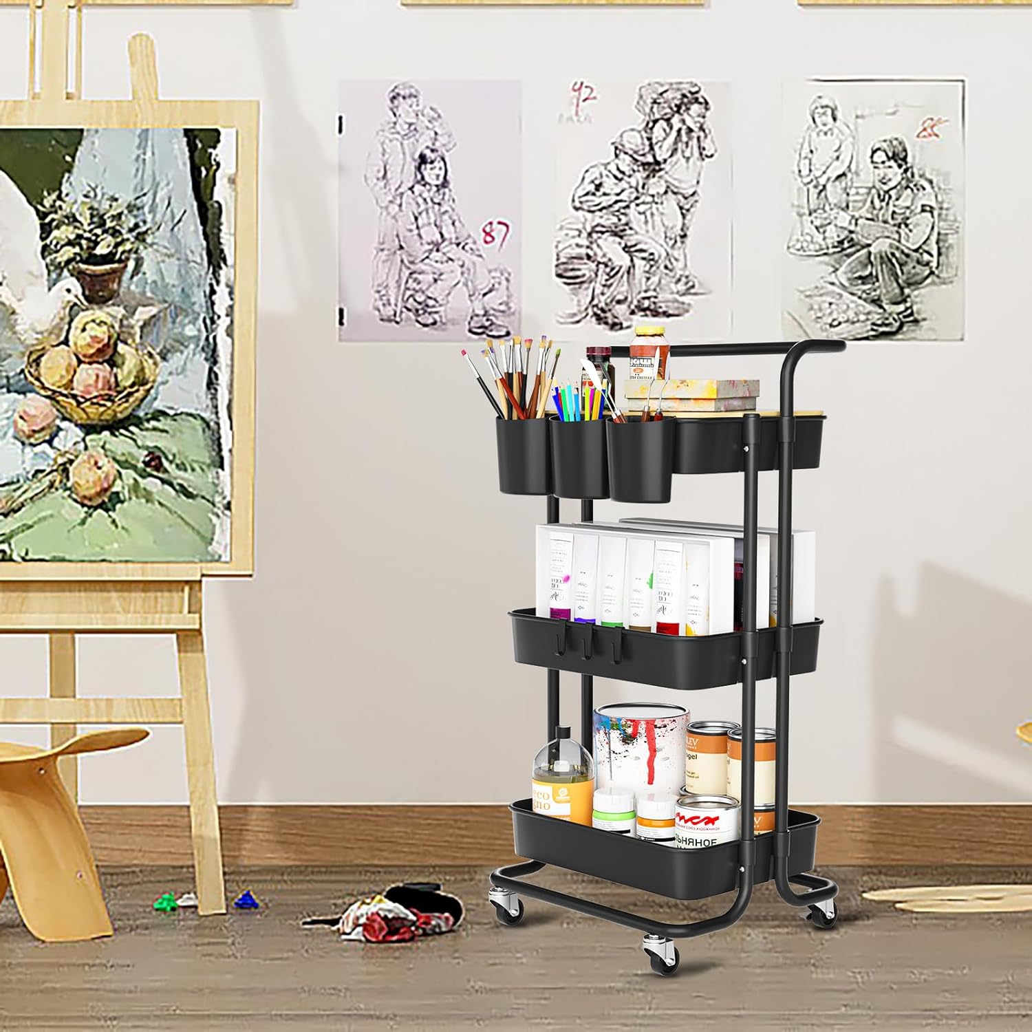 - 3 Tier Detachable Multifunctional Metal Rolling Cart with Metal handle,3 Hanging Cups,3 Hooks,1 Plank , 3 Plastic Storage Basket and 4 wheels including 2 Lockable Casters and 2 normal wheels. 3 tier rolling cart black, 3 drawer storage organizer black, 3 tier shelf black, 3 tier cart black, 3 tier storage organizer black, 3 tiered rolling cart black, 3 tier rolling cart metal black, 3 tier drawer organizer black, 3 tier metal rolling cart black, 3 tier cart with wheels black,