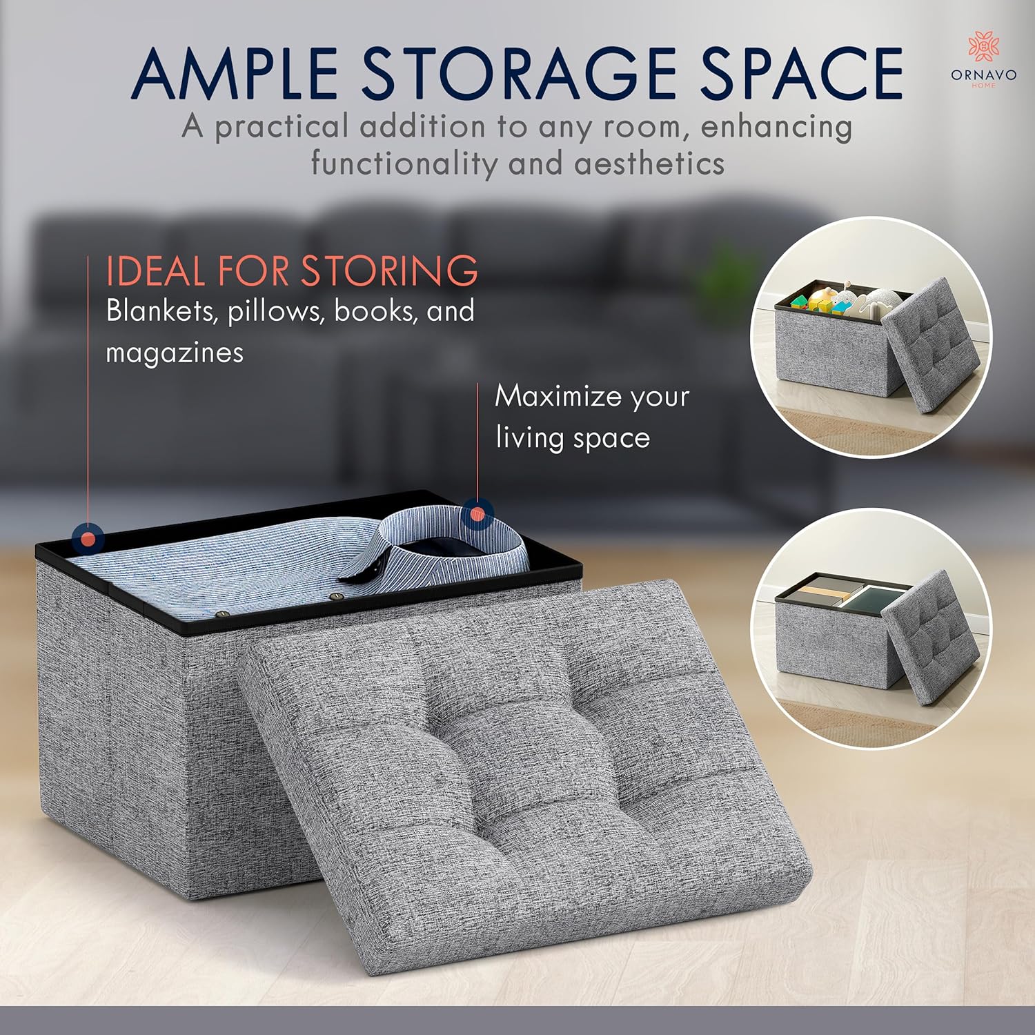 Ornavo Home Small Storage Ottoman, Set of 2, Foldable Collapsible Rectangle Linen Ottoman Foot Rest Stool Seat, for Living Room, Bedroom, Home Office, Dorm - 12 x 16 x 12, Gray