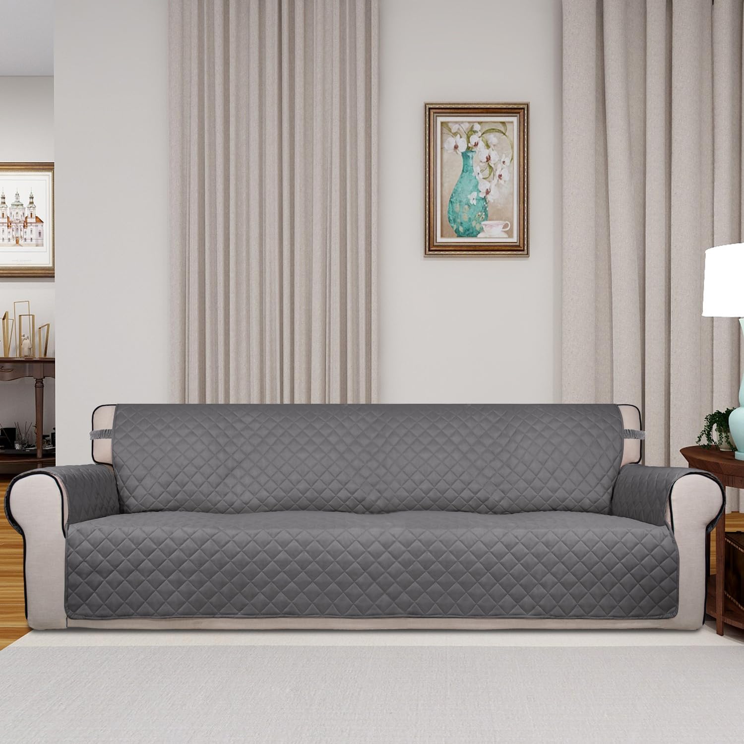 - SUPER DURABLE 3-LAYERS QUILTED FABRIC: Quilted from tear-resistant Microfiber fabric (polyester composition), this durable sofa furniture cover is composed of 3 layers with thick poly foam filling for extra comfort & softness. Our couch slipcovers are designed and ready-made to fit a variety of 4 seater sofa sizes with seat width up to 88".