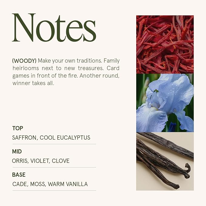 - Hearth & Velvet Flame: A captivating blend of saffron and fresh thyme evolves into a heart of velvety orris, raspberry, and violet, while a base of rugged cade, earthy moss, and warm vanilla lends depth to this aromatic fragrance, evoking a touch of festive elegance.