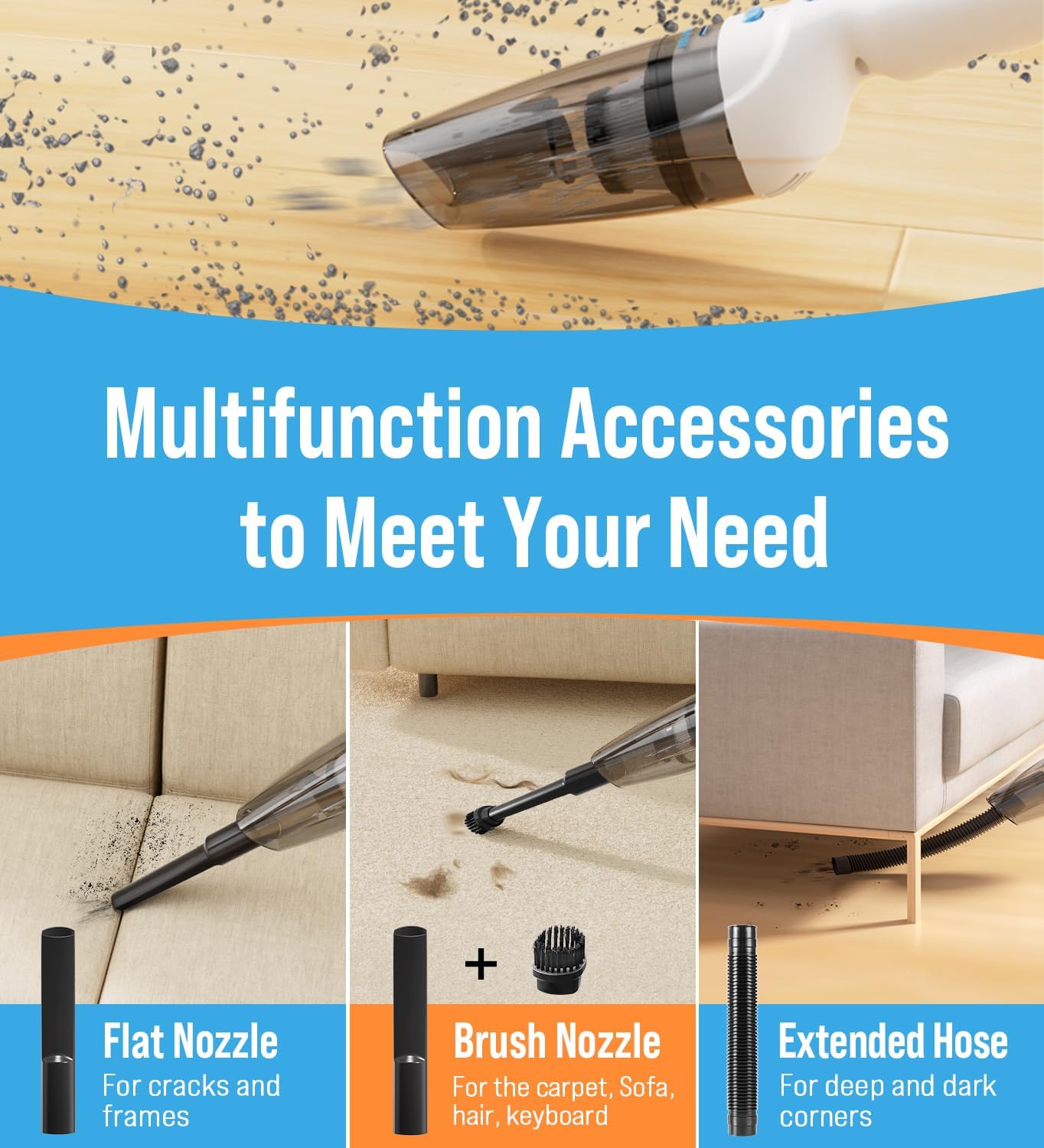 - ăDEEP CLEANING & NO BLIND CORNERSă: The handheld vacuum cleaner is equipped with 3 multi-function accessories (flathead, extendable, or brush nozzle) to support all-round cleaning. 500ML large-capacity transparent dust bucket, and the "one-button dust removal" design makes emptying easy. HEPA filter can effectively filter dust and fine particles to avoid secondary pollution. Regular cleaning of the washable filter prevents loss of suction and blockage, maintains good suction.