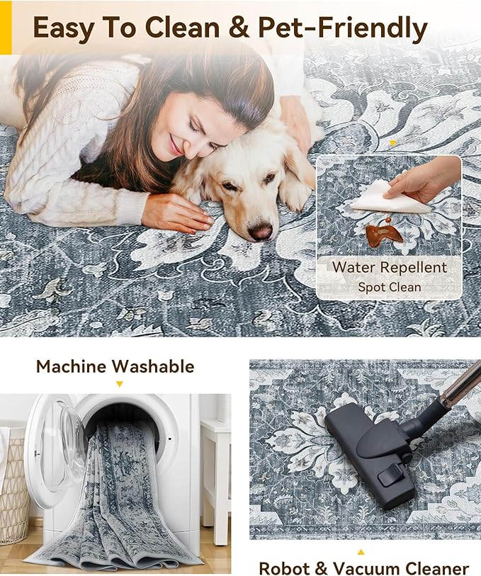 - Soft Surface and Non-slip Backing: this area rug is made of low-pile soft material which feels great underfoot. With its low pile, the fibers are short and tightly packed together, creating a smooth and even surface. Your pets gonna love it. And the non-slip backing makes the rug stays in place.