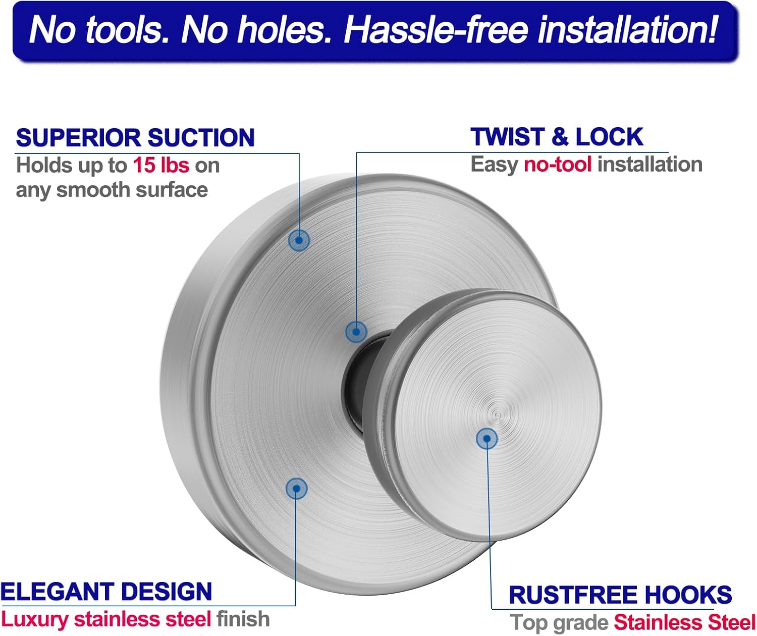 - [VacuumLock Pro Seal Technology]: Suction hooks utilize advanced vacuum suction technology and feature a super-sticky silicone base for strong, reliable support. Twist the hook rod clockwise to expel air and maximize suction. Each hook can hold up to 15 lbs