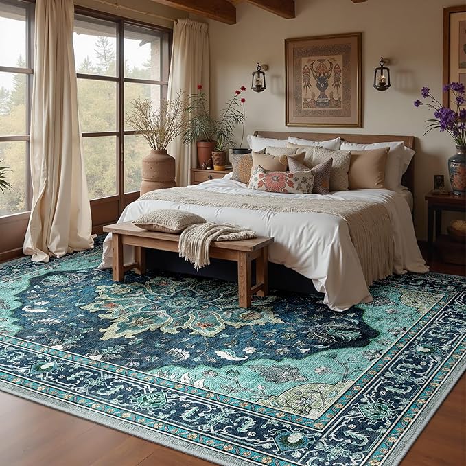 RELEANY Area Rugs 10'x14' Washable Non-Slip, Floral Vintage Distress Print Pattern Medallion Carpet for Living Room Bedroom Dining Room, Teal Green Lake Blue Turquoise