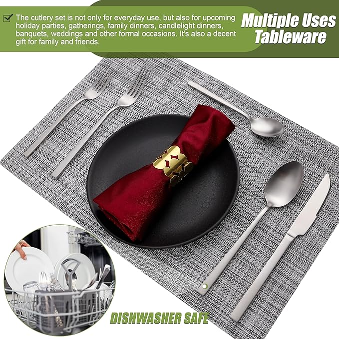 - 【Application Occasion】The matte silverware set is simple and classic, suitable for various occasions, such as family daily use, parties, gatherings, family dinners, candlelight dinner, banquet, camping, Thanksgiving, BBQ, wedding and other formal occasions.