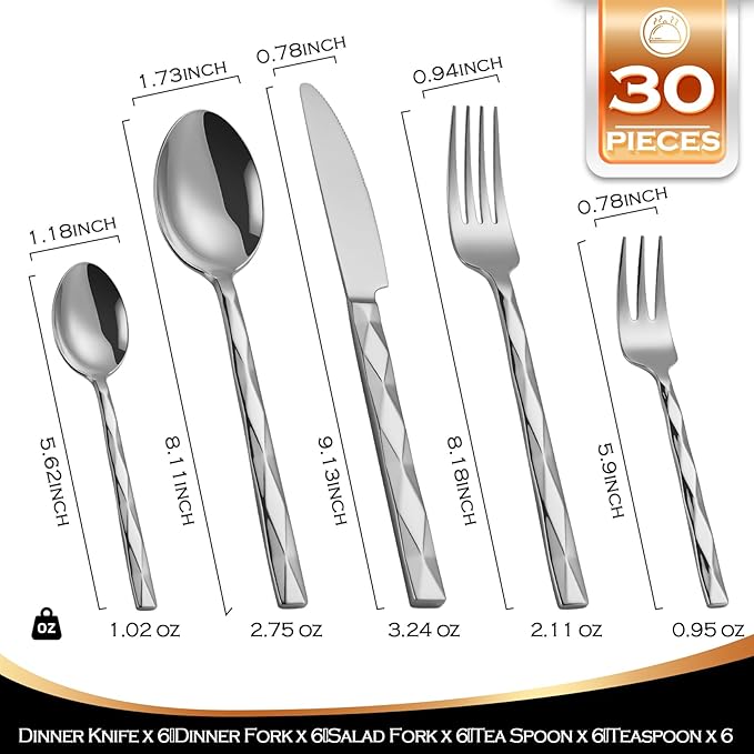 Silverware Set, Luxury 30-Piece Flatware Set for 6, Cutlery Set Stainless Steel, Diamond Cut Pattern, Home, Wedding & Party, 18/10 Stainless Steel Tablewaret & Dishwasher Safe Utensils.