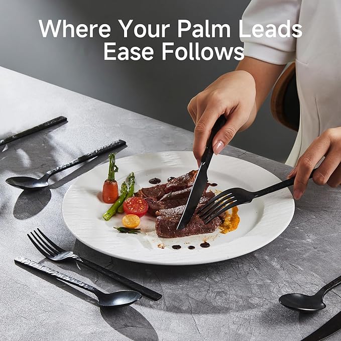 - BLACK POLISHED FINISH- Using black vacuum coating technology to add a food-grade black coating to the stainless steel surface, the tableware exudes luxury everywhere. These flatware strike a note of modern elegance in streamlined metal and matte-black color.