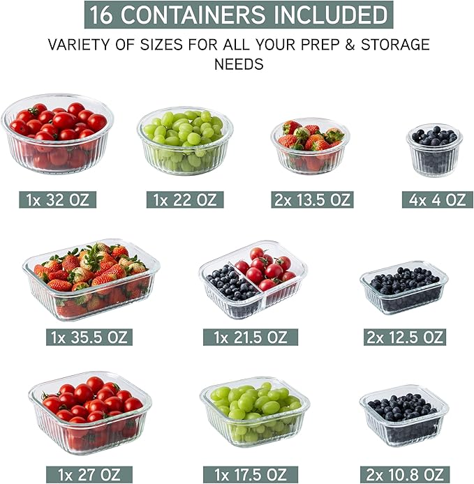 - Versatile 32-Pc. Glass Food Container Set: Includes 4 rectangular, 8 round, and 4 square containers, providing a variety of sizes and shapes for all your meal prep and storage needs.