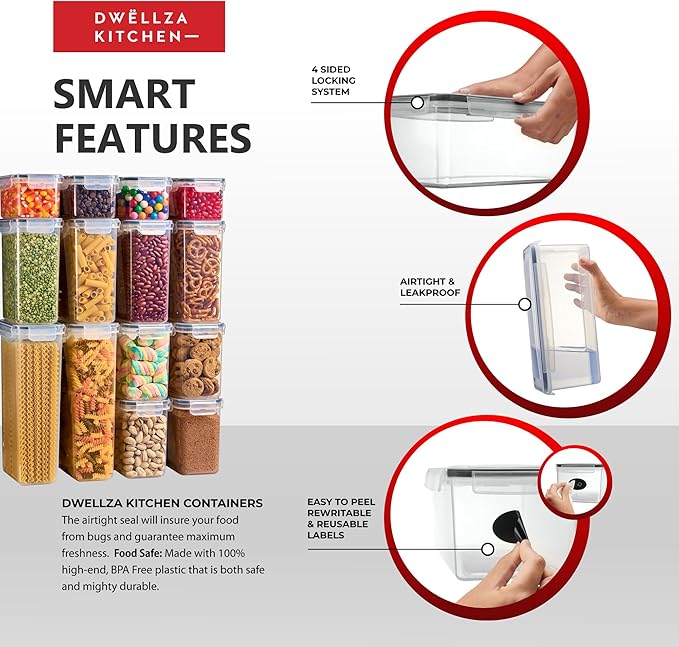 DWËLLZA KITCHEN Set of 14 Airtight Food Storage Containers for Pantry Organization and Storage - Sugar, Flour, Pasta, Spaghetti Plastic Air tight Kitchen Storage Containers With Lids, Labels & Marker