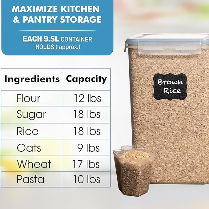 - 【 SUPERSIZE STORAGE (9.5L / 321 OZ EACH) 】 Includes 2 Extra Large 9.5L/321 Oz flour sugar storage containers with airtight lids. Each rice container (7.1 x 9.3 x 12.5 inches) provides ample space for flour, sugar, rice, grains, beans, cereal, pasta, coffee and more. This set comes with 2 measuring cups. Great for pantry storage containers.