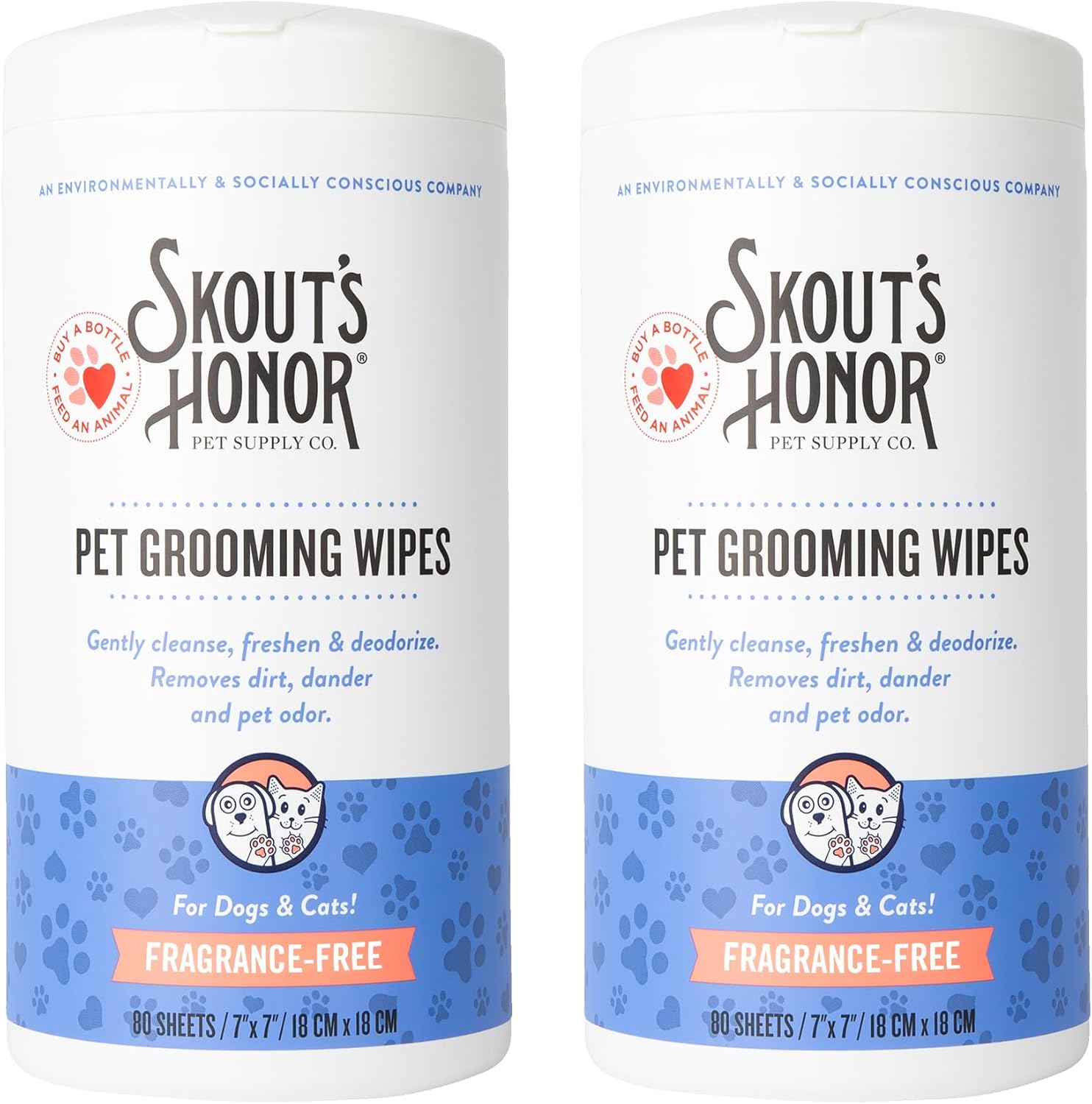 SKOUT'S HONOR Pet Grooming Wipes for Dogs and Cats - Deodorizing, Plant-Based, Biodegradable, Fragrance-Free - for Paws, Faces, Skin Folds & Bums, 80 Count, 2-Pack