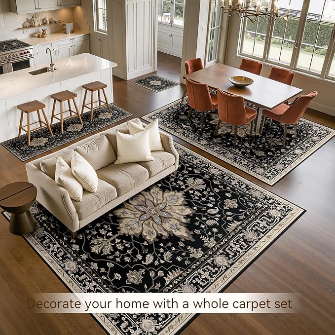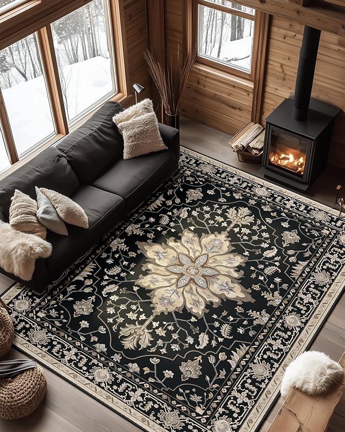 RELEANY Area Rugs 5'x7' Washable Non-Slip, Floral Vintage Distress Print Pattern Medallion Carpet for Living Room Bedroom Dining Room, Black Brown Neutral Dark Tan