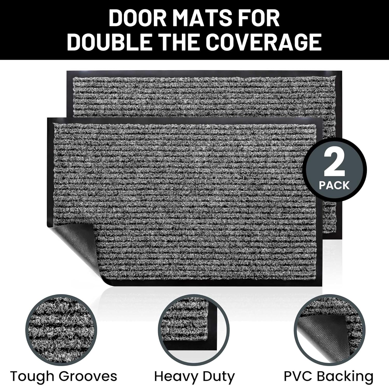 - Includes 2 BATTLESHIP GRAY X-Large Indoor Outdoor Floor Mats: Enjoy two amazing heavy duty high quality ribbed polyester door mats (Larger 48" x 36") that will be perfect welcome for the everyday home. Amazing value 2-Pack.