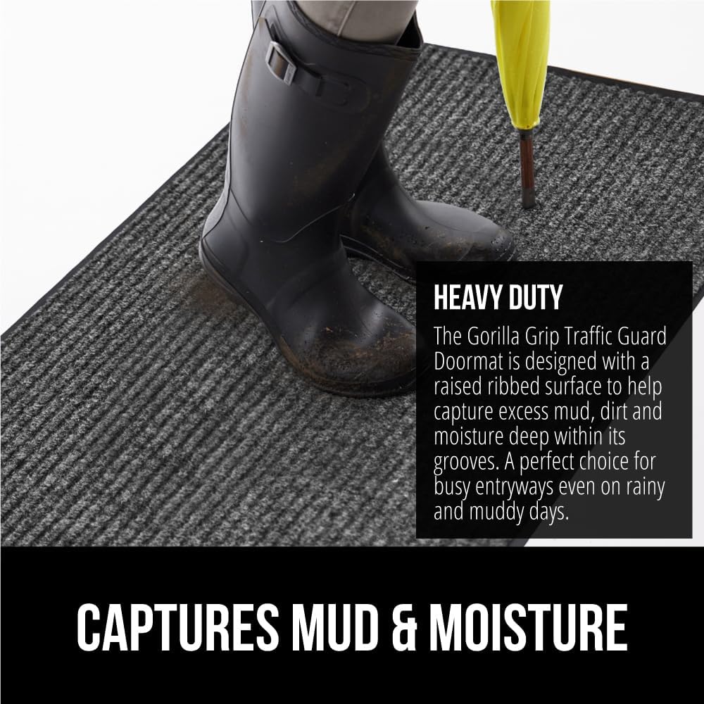 - BUILT TOUGH FOR HIGH TRAFFIC: the Gorilla Grip Traffic Guard doormat is ultra strong and built tough to withstand high foot traffic; constructed with a high quality textured rubber backing and raised fabric topside to help scrape off dirt and debris; thick and plush topside is gentle on bare feet, but durable for boots