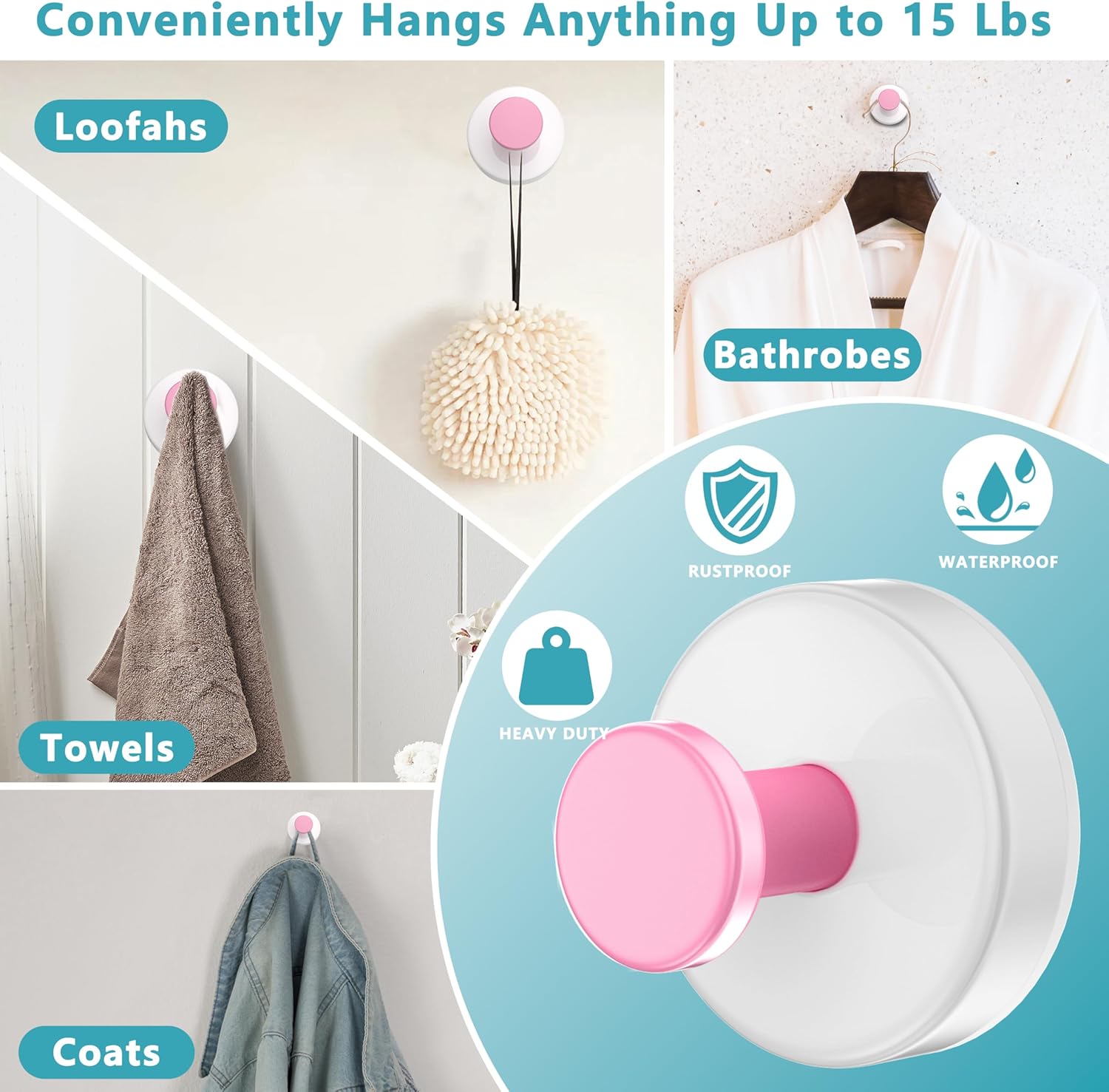 Suction Cup Hooks for Shower,Removable No Drill Towel Hooks,Upgraded 15 lbs Strong Suction hooks for Bathroom Tile,Shower Wall,Glass Door,Kitchen-Loofah,Coat,Stainless Waterproof-White Pink 4 Pcs