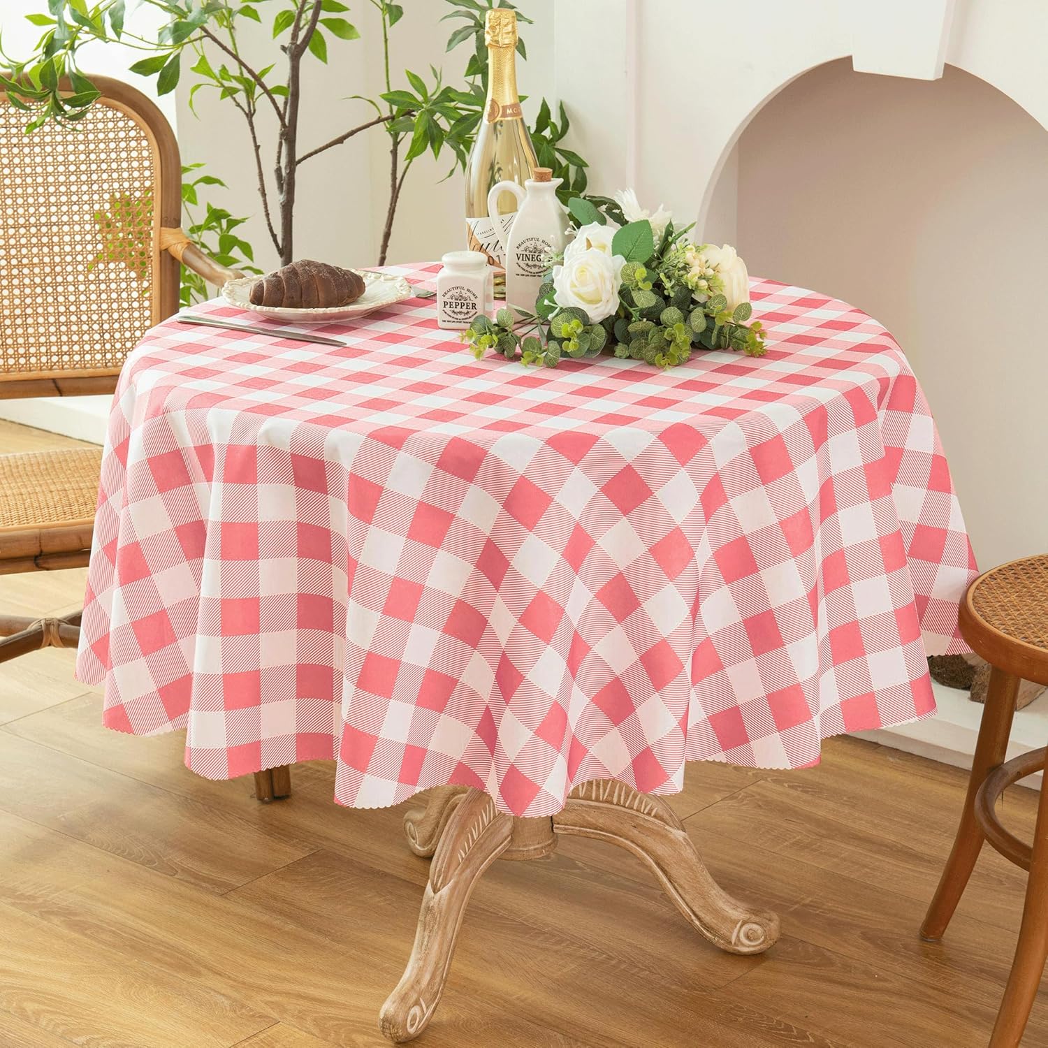 - CLASSIC GINGHAM CHECKERED DESIGN: Our checked tablecloth features a pattern of small, evenly spaced checks in two contrasting colors, often white and another color. The classic gingham plaid pattern for table cloth is a timeless and versatile choice