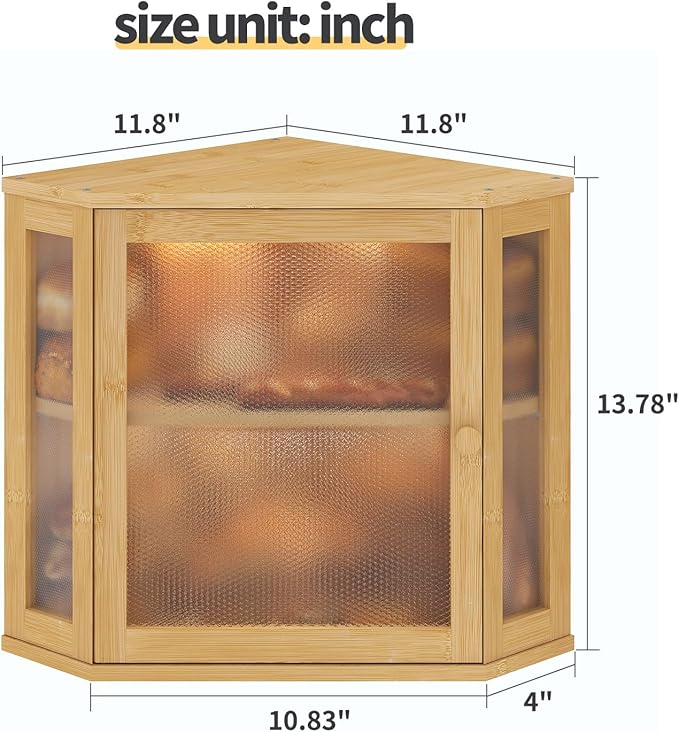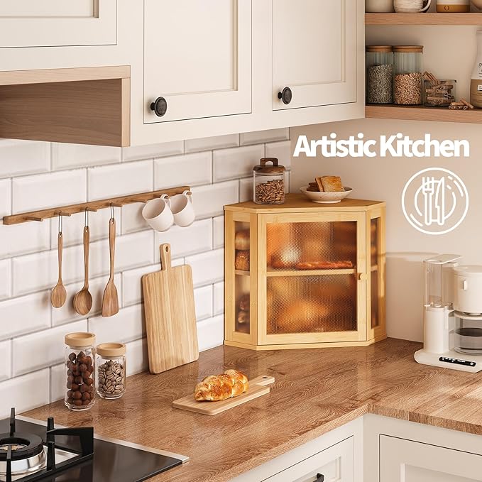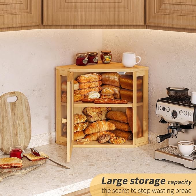 Corner Bread Box for Kitchen Countertop,Bread Storage for Homemade Bread, Double Layer Large Bamboo Kitchen Storage Bin with Window (Natural, Medium)