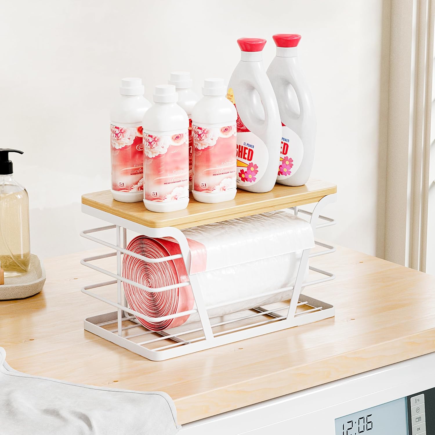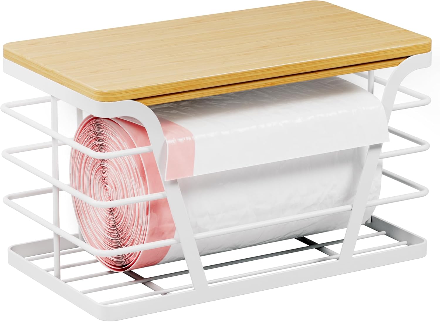 Small Grocery Bag Holder, Trash Bag Dispenser with Removable Bamboo Top, No Drill,White
