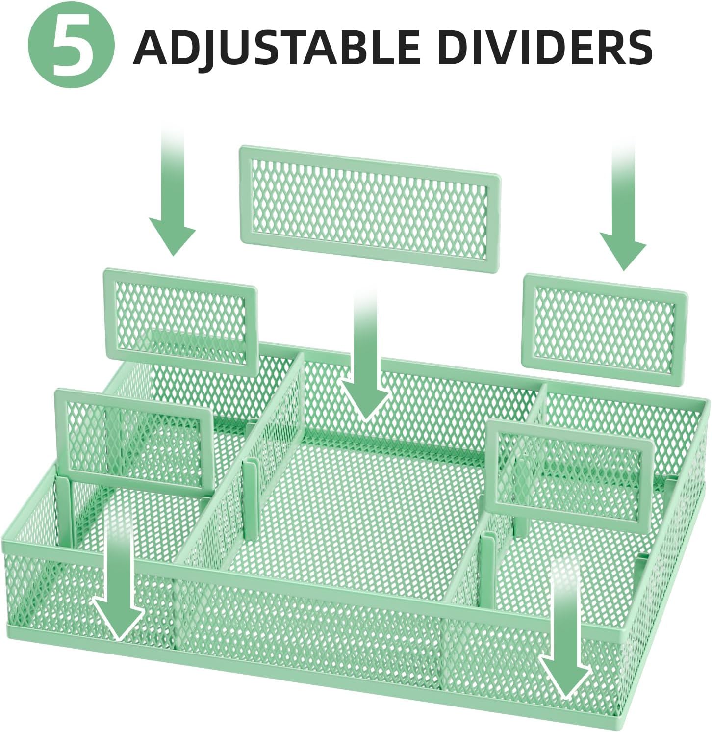 Marbrasse 2 Pack Desk Drawer Organizer, Mesh Drawer Organizer Tray with 8 Adjustable Compartments, Desk Organizers and Accessories, 5 Dividers Drawer for Office Supplies, Makeup & Vanity (Green)