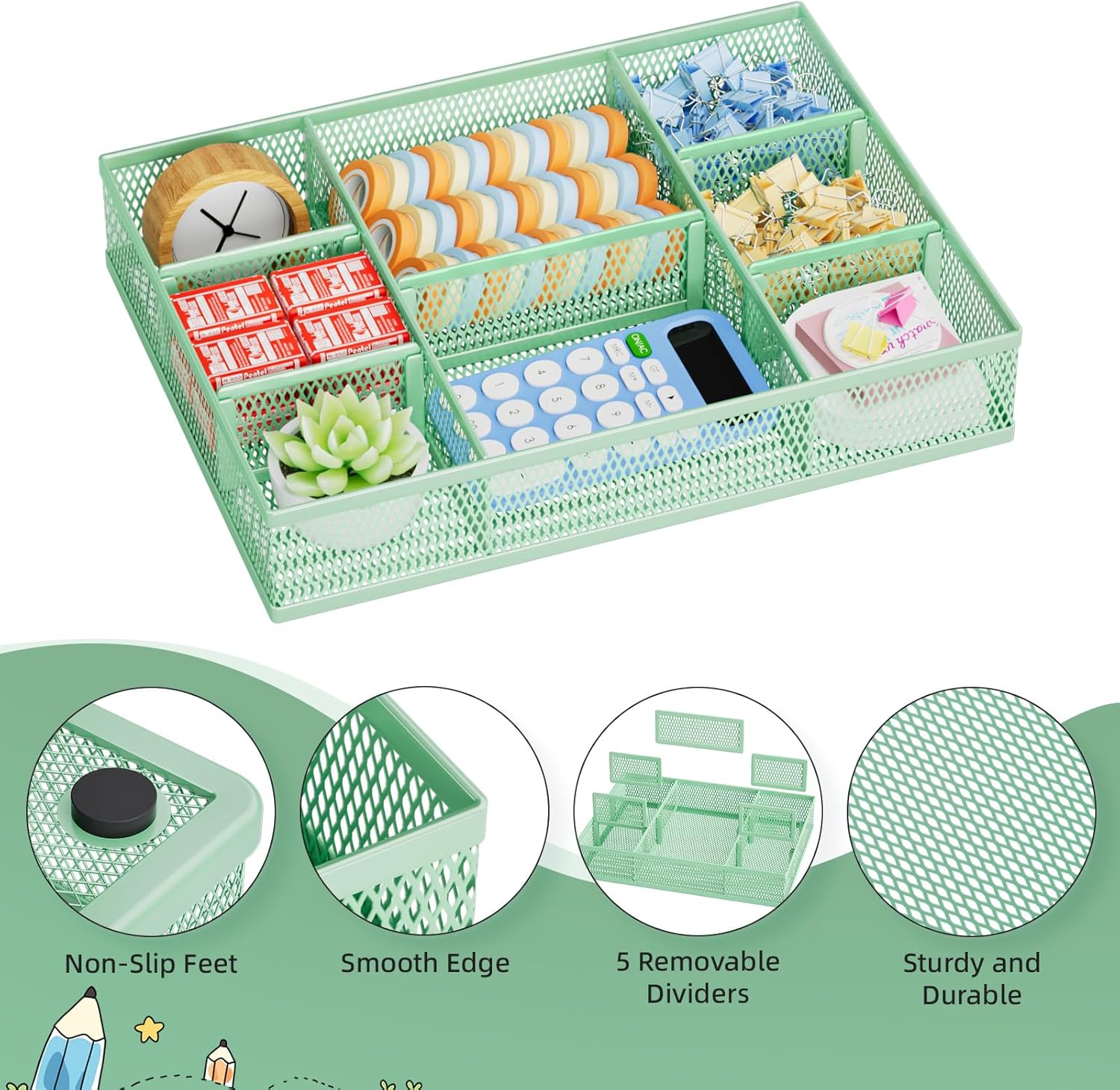 - 【Adjustable Dividers】: Our drawer organizer features 4+1 removable dividers. You would configure the size to fit varisized desk accessories, such as pens, erasers, highlighters, notes, staplers, tapes, clips