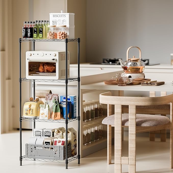 - Strong & Durable: Built with high-quality carbon steel, this 4-tier wire shelving unit offers reliable strength and long-term durability. Perfect for organizing kitchen supplies, office essentials, or household tools.