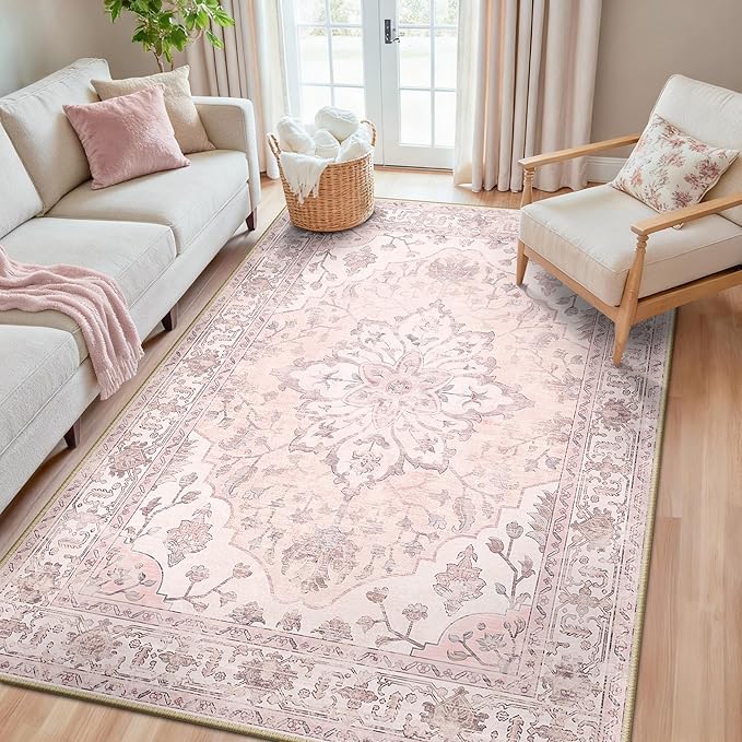 RELEANY Area Rugs 5'x8' Washable Non-Slip, Floral Vintage Distress Print Pattern Medallion Carpet for Living Room Bedroom Dining Room, Pink Greypink Cute