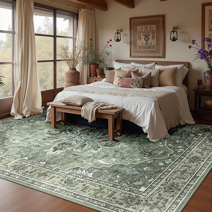 RELEANY Area Rugs 5'x8' Washable Non-Slip, Floral Vintage Distress Print Pattern Medallion Carpet for Living Room Bedroom Dining Room, Dark Green Gray