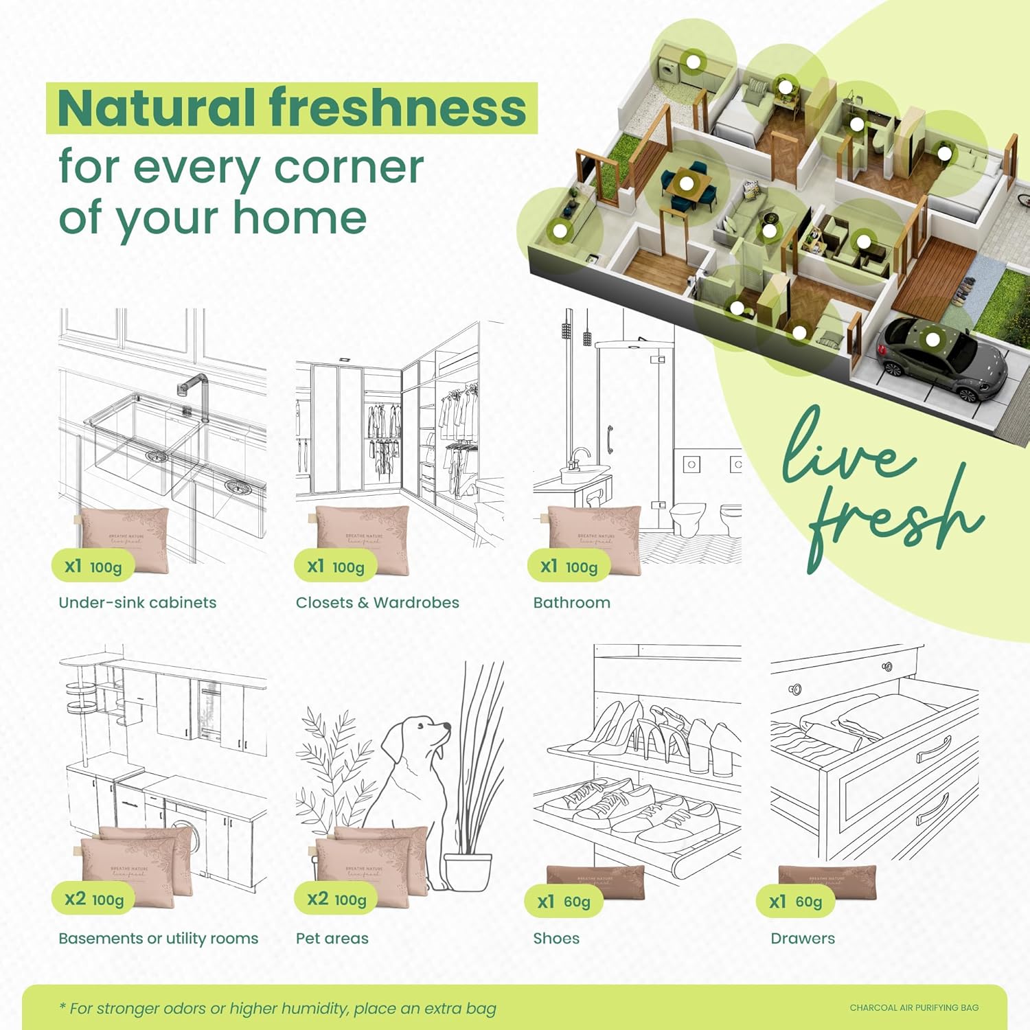 - STYLISH AIR PURIFIERS – Designed to blend seamlessly into any space, our charcoal deodorizer bags offer powerful freshness with a clean, modern look. Use them as a car charcoal odor eliminator or place them in your home to eliminate odors effectively