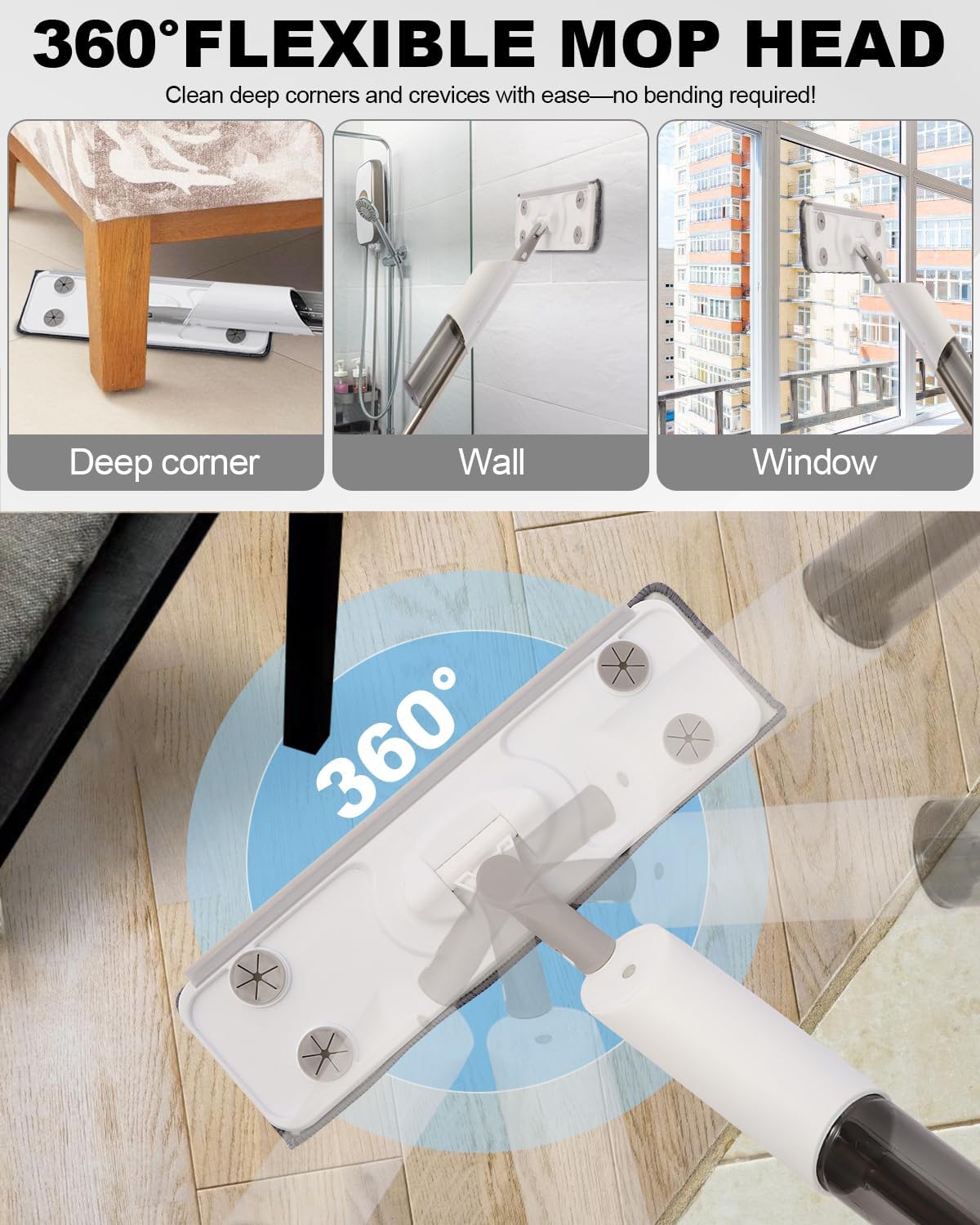 - 【360° rotation of the mop head, suitable for various scenes】Small size mop head, all kinds of details can be taken care of.360° flexible rotation of the mop head, no need to bend, easy to go into the bottom of the furniture, such as under the sofa, under the bed.And light weight, lift up not laborious, can be used to clean walls and Windows not tired hands.