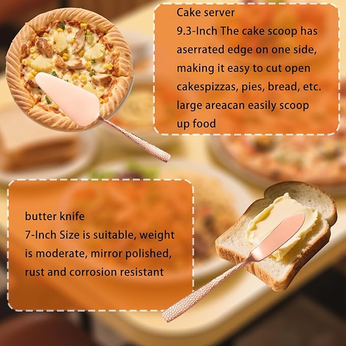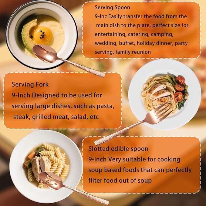 Large Hostess Serving Utensils Set, Stainless Steel Heavy Duty Hammered Serving spoons, Slotted Spoons, Serving Fork, Cake Server, Butter Knife, Dishwasher Safe(Rose Gold)