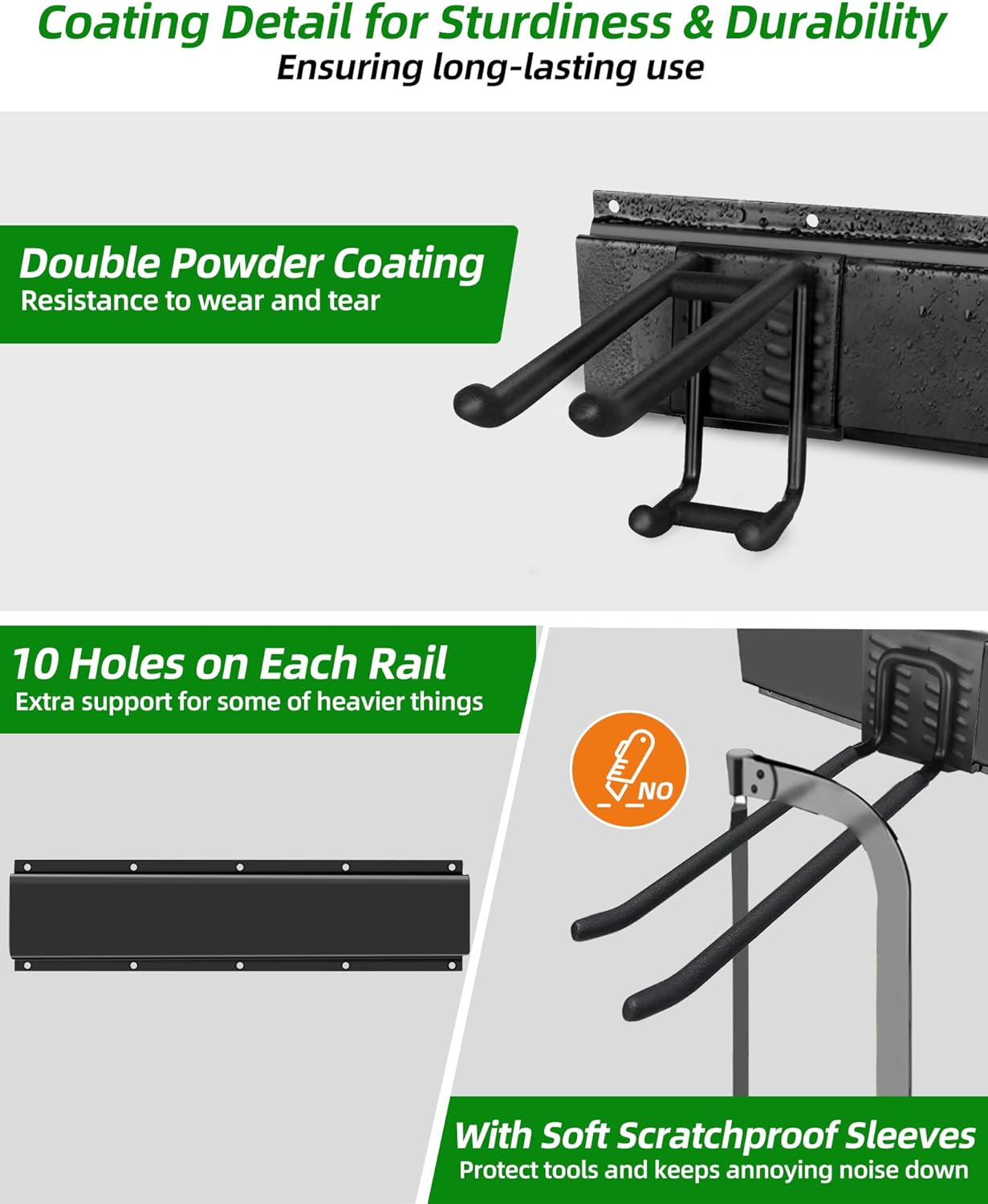 - Space-Saving Design: The hooks have a nice soft coating that will protect tools keeps any rattle or annoying noise down with you place thing on or take things off the rack. Tool rack Utilizes unused wall space, helping keep garage tidy and clutter-free