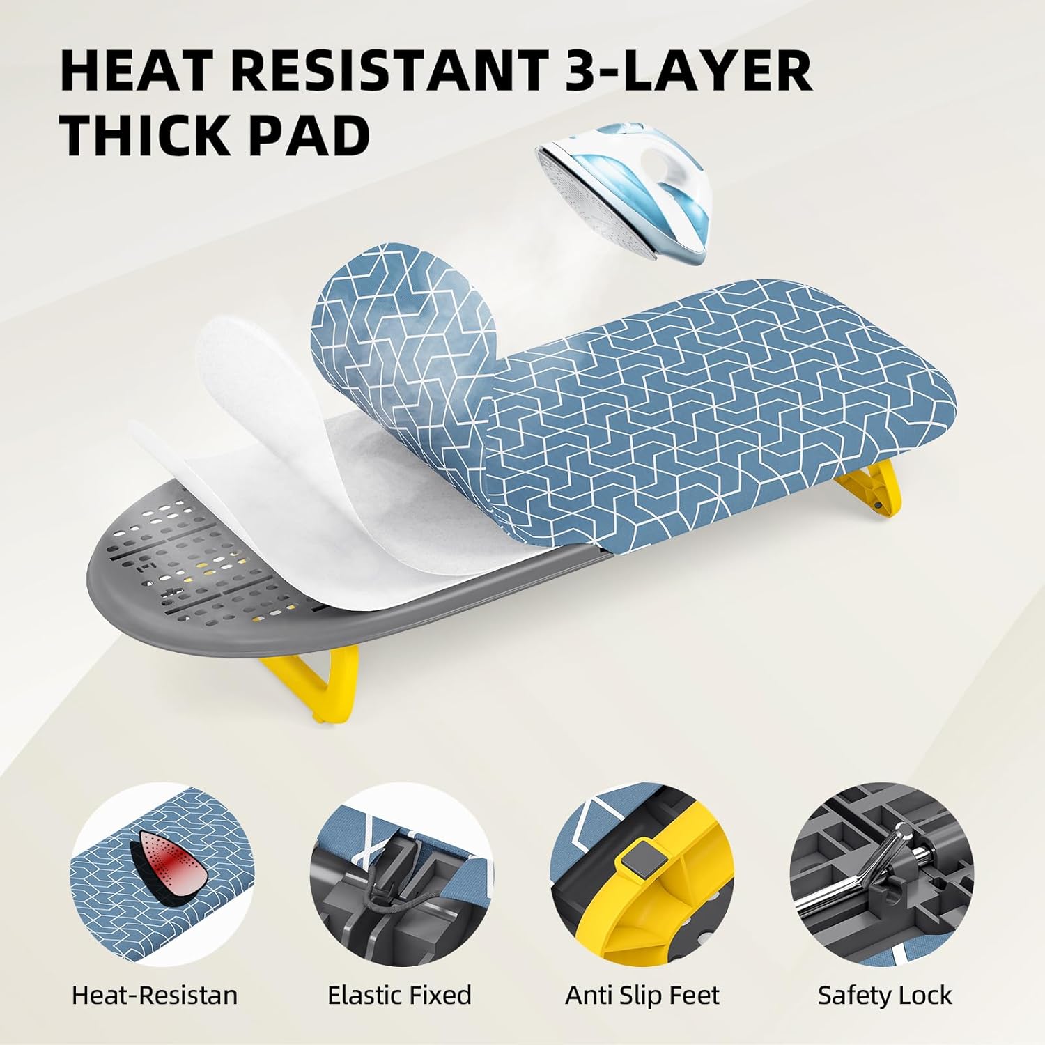 - [Detachable& Heat-Resistant Covers] Equipped with thick 100% cotton cover and padded felt, our mini ironing board provides good ventilation and super-smooth ironing. The covers of this compact ironing board can be detached for easy cleaning.