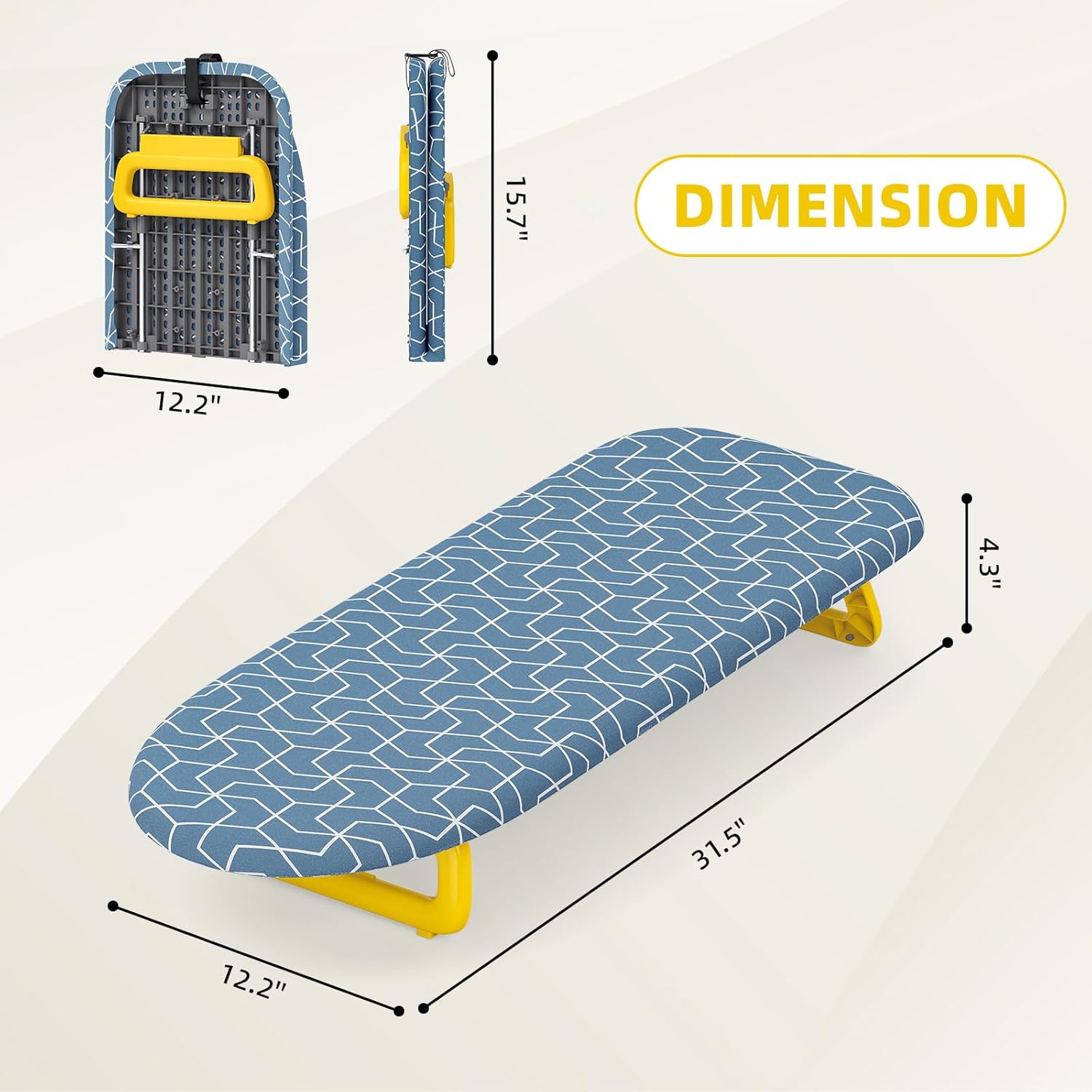 - [Foldable & Space Saving Design] This small ironing board tabletop can be folded easily for compact storage.When folded, the table top ironing board measures 32"x12" and only 2 inches in thickness, fitting most samll places.