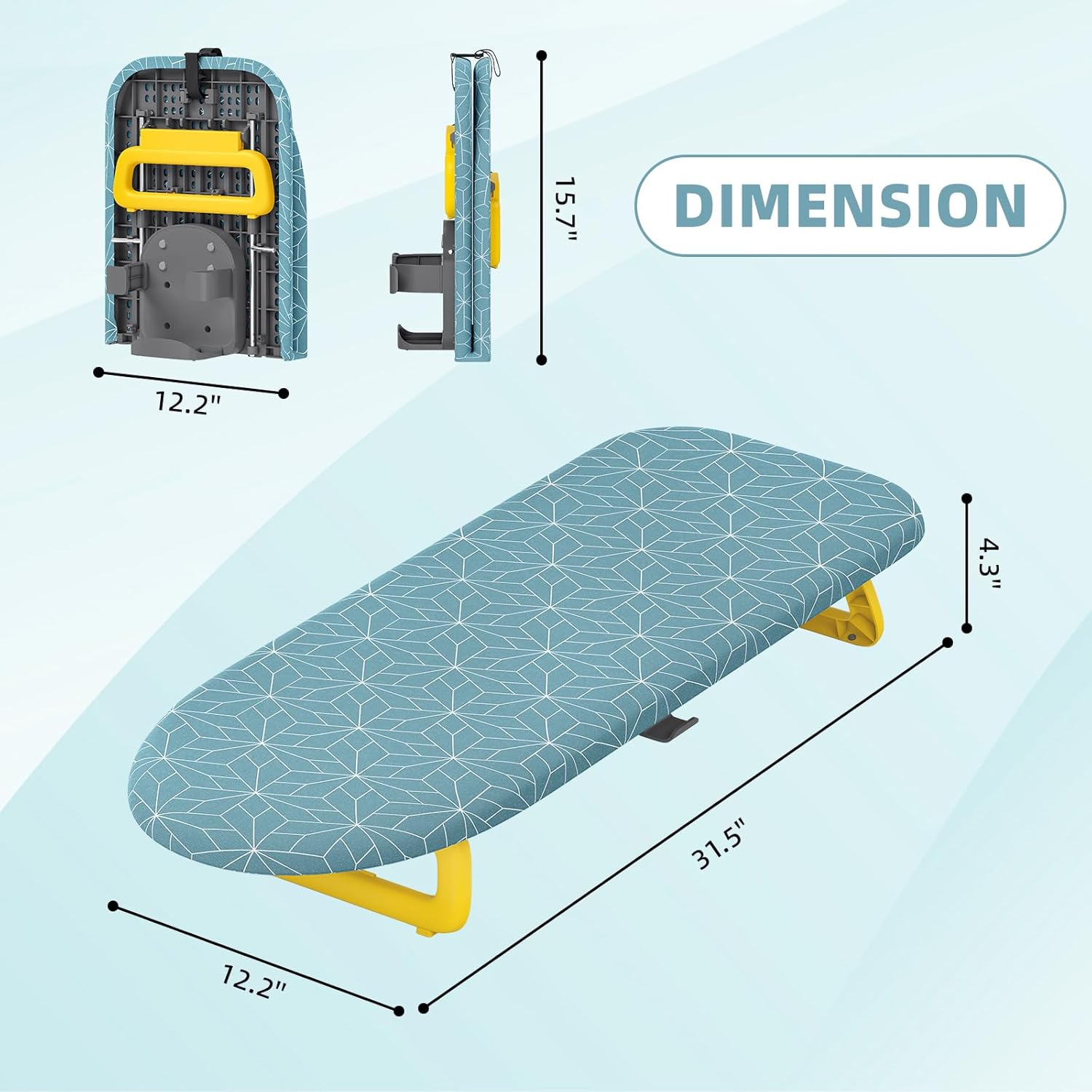 - [Foldable & Space Saving Design] This small foldable ironing board tabletop can be folded easily for compact storage.When folded, the mini ironing board measures 32"x12" and only 2 inches in thickness, ideal for small dorms, laundry rooms, apartments and can be put into a suitcase when traveling.