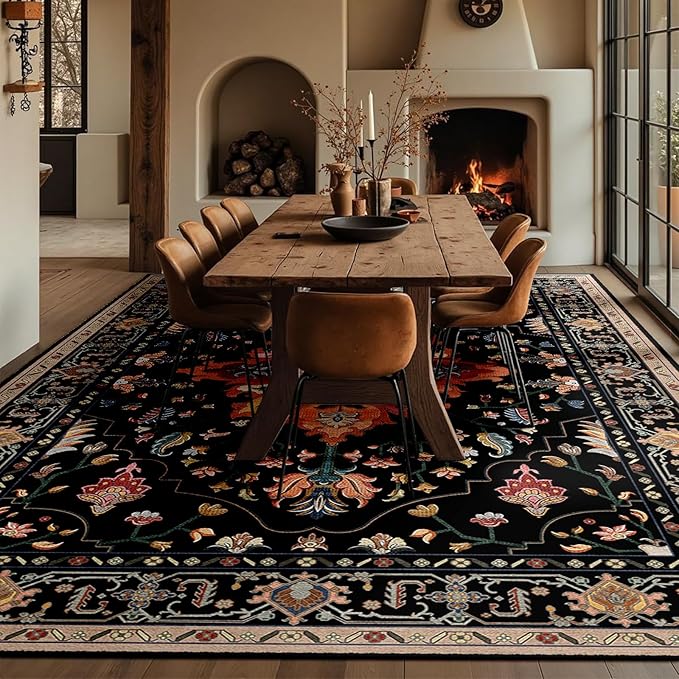 RELEANY Area Rugs 10'x12' Washable Non-Slip, Floral Vintage Distress Print Pattern Medallion Carpet for Living Room Bedroom Dining Room, Black Colorful Floral Dark Tan