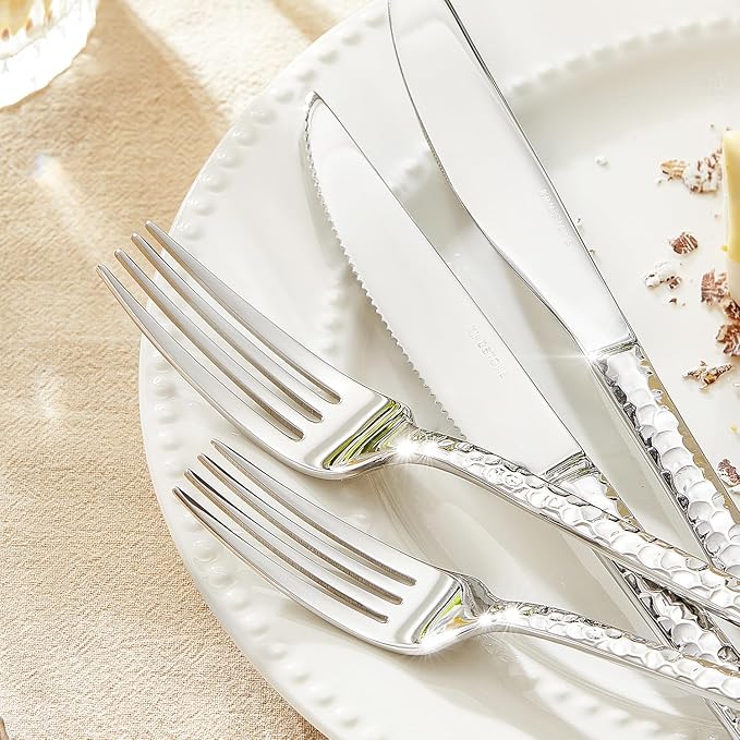 KINGSTONE 48 Piece Silverware Set with Steak Knives, Hammered Silverware Set for 8, 18/10 Stainless Steel Flatware, Cutlery Set for Home, Party, Wedding, Mirror Polished Dishwasher Safe
